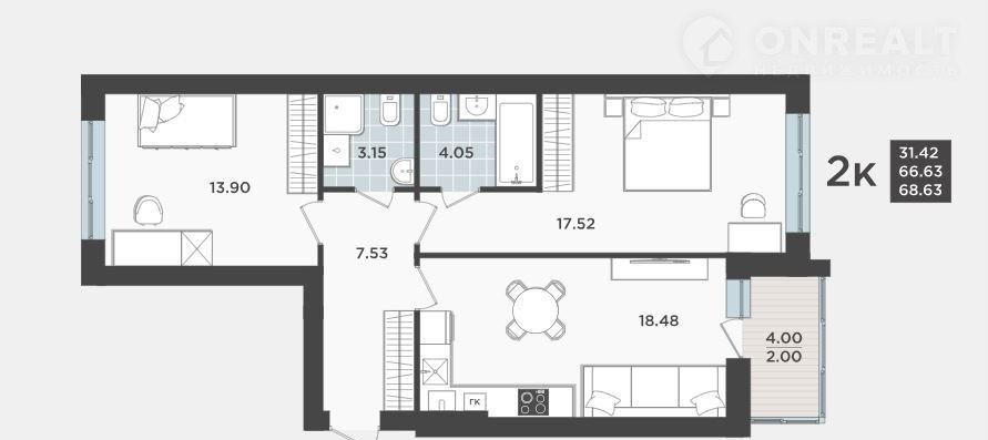 Общая площадь 66.6 м2