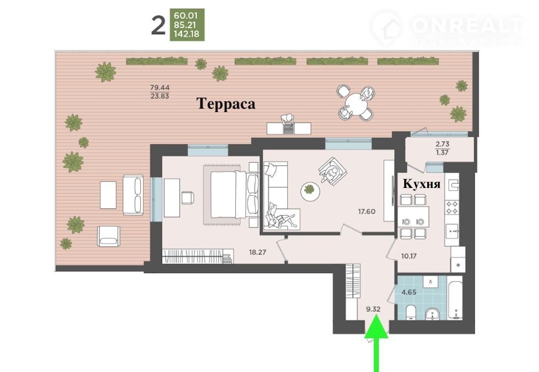 • 2-комнатная квартира С ТЕРРАСОЙ на втором этаже.