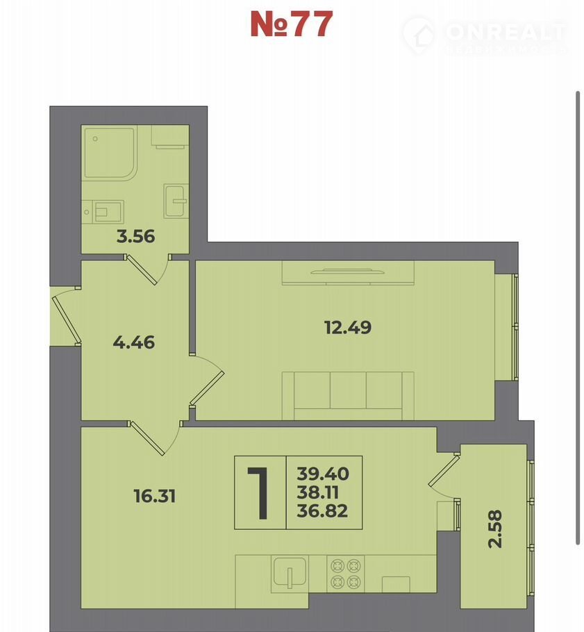 Общая площадь 39.4 м2