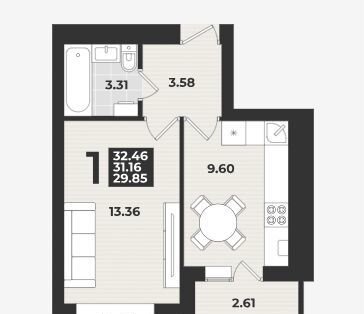 Общая площадь 32.5 м2