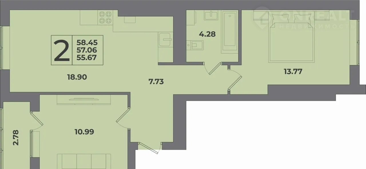 Общая площадь 58.5 м2