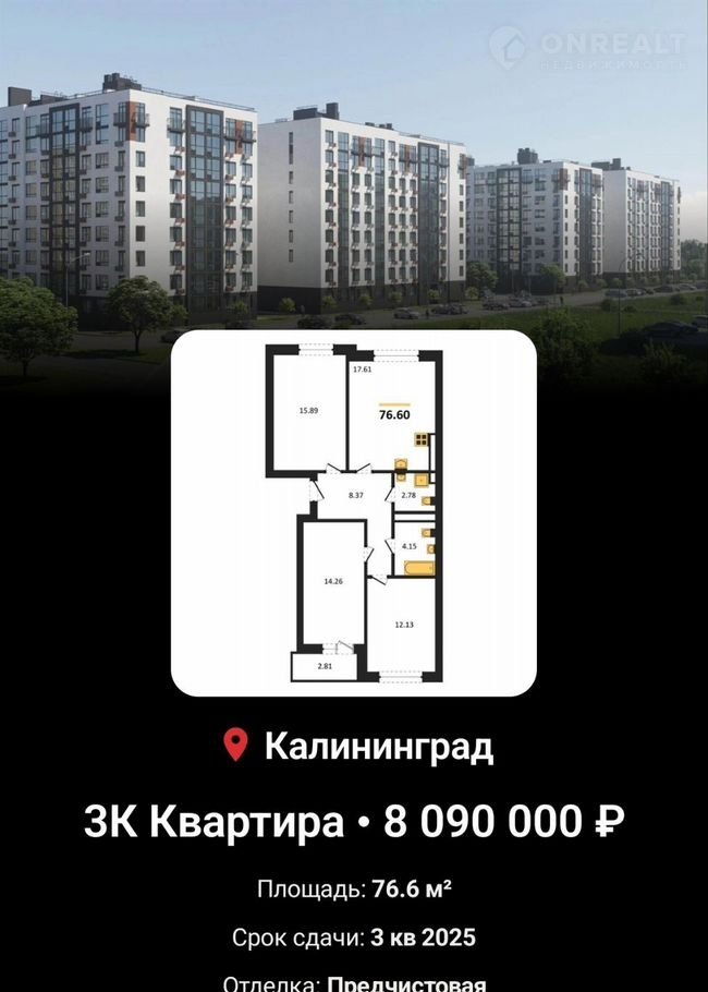 3-комнатная квартира, 76.6 м2, этаж 7 / 9, на продажу в Калининграде