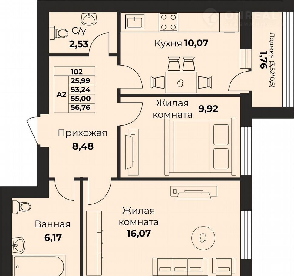 Общая площадь 56.4 м2