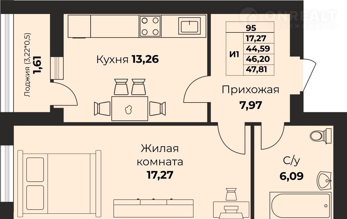 Жилая площадь 17.1 м2