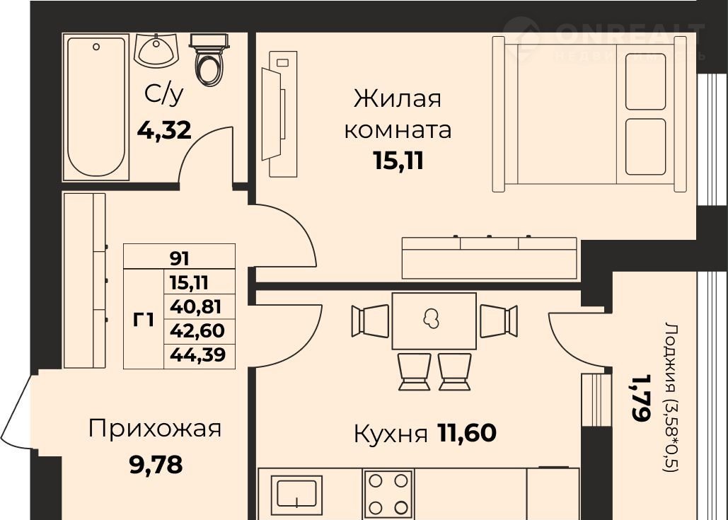 Общая площадь 39.7 м2