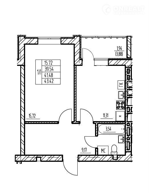 Общая площадь 41.5 м2