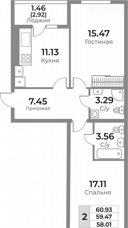 Общая площадь 59.5 м2