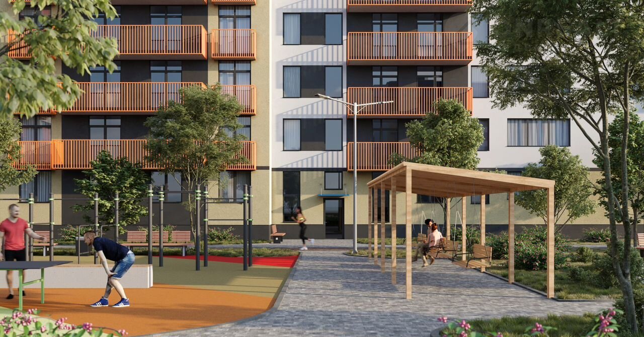 В центре комплекса расположен пруд, вокруг которого будет организована благоустроенная точка притяжения жителей всего комплекса, с большой детской и спортивной площадкой и зоной отдыха для взрослых.