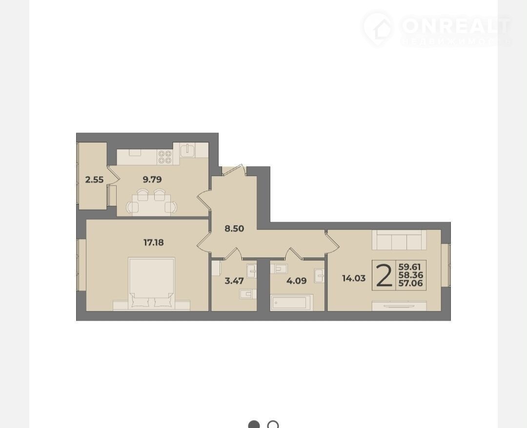 2-комнатная квартира, 59.6 м2, этаж 3 / 9, на продажу в Калининграде