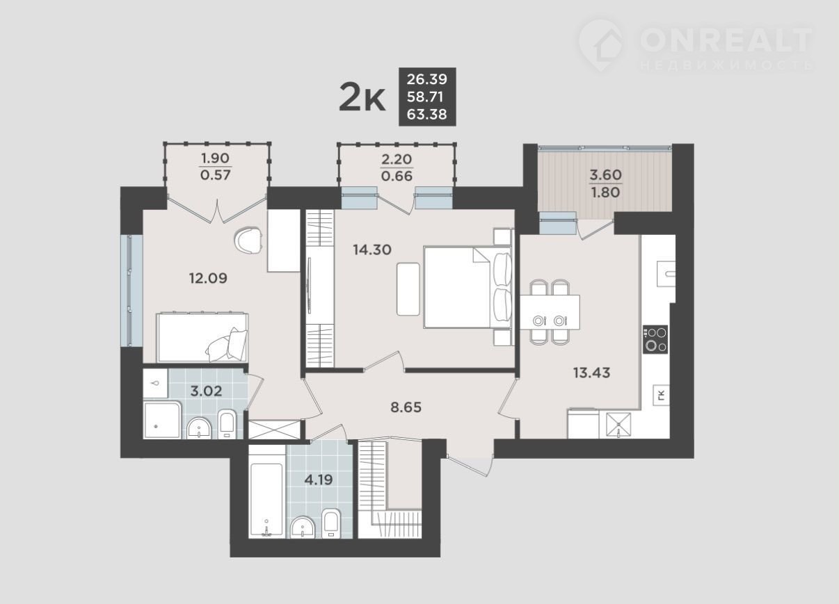 2-комнатная квартира, 58.7 м2, этаж 8 / 8, на продажу в Калининграде