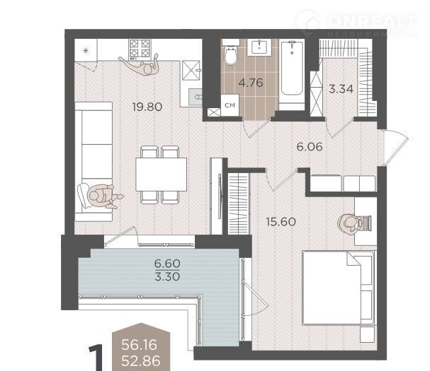 Общая площадь 52.9 м2