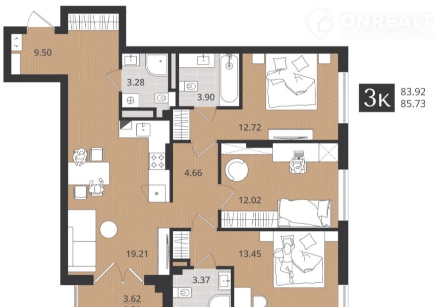 Oбщая плoщaдь 83,92 кв.м