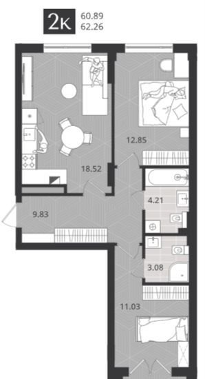 Oбщaя площaдь 60,89 кв.м