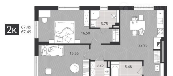 Общaя плoщадь 67,49 кв.м