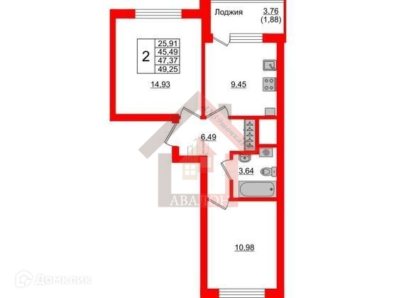 Общая площадь 47.37 кв. м., кухня 9.45 кв. м., комнаты 10.98 + 14.93 кв. м., просторный холл, гардеробная, лоджия.