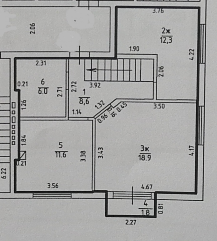 На первом уровне расположены: кухня 11,6 кв.м., гостиная 18,9 кв.м, комната 12,3 кв.м, совмещённый санузел 6,0 кв.м, коридор 8,6 кв.м.