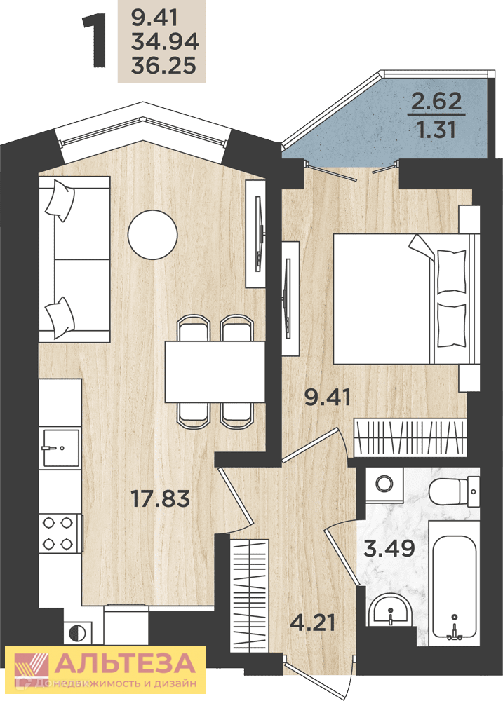 Поможем в оформлении ипотеки, юридическое сопровождение сделки. Звоните!, Калининград г, Московский, Батальная улица 96, 1 комн., общ. пл. 36.25 кв.м., жил.пл. 9.41 кв.м., комнаты 9.41, кухня 17.83 кв.м., 1/16 этаж, окна двор, санузел совмещенный, лоджия, без отделки, Номер лота: 4100139