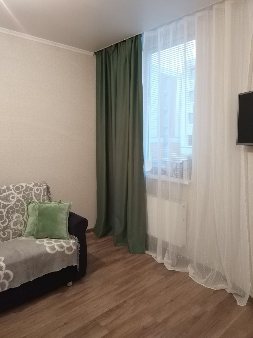 В квартире автономное отопление, ламинат, плитка, натяжные потолки. В прихожей - тёплый пол. В ванной комнате: качественная плитка, удобная душевая кабинка с высоким поддоном, инсталляция, большое зеркало встроенное в плитку, раковина с тумбой. В комнате место для углового дивана. Ростелеком приставка (TV, интернет).