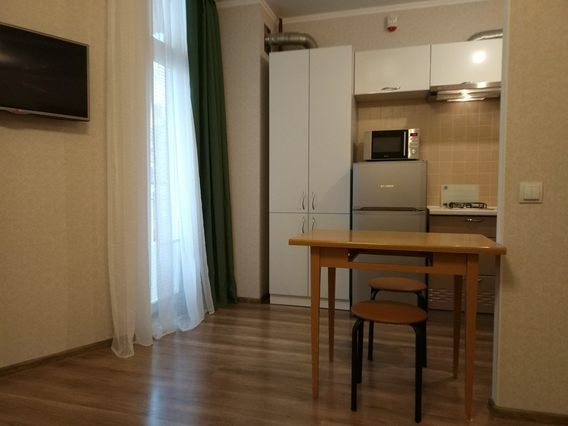 В квартире остается вся мебель и техника: кухонный гарнитур, вытяжка, холодильник (Liebherr), варочная поверхность, духовой шкаф, большой шкаф в прихожей, стиральная машина, телевизор.