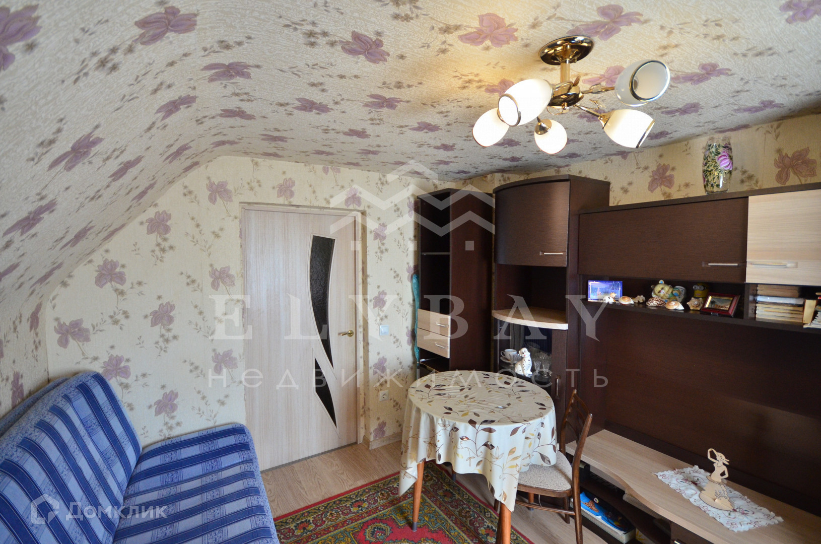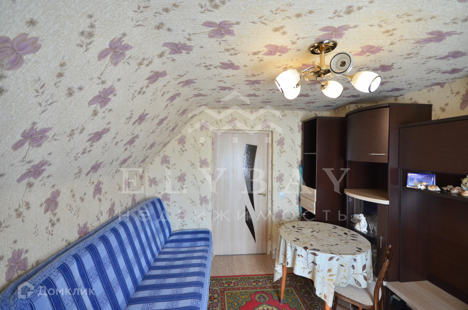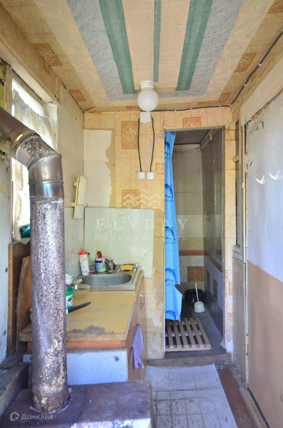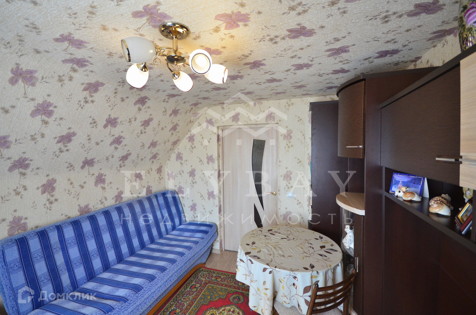 Потолки в комнате оклеены обоями, в кухне побелены