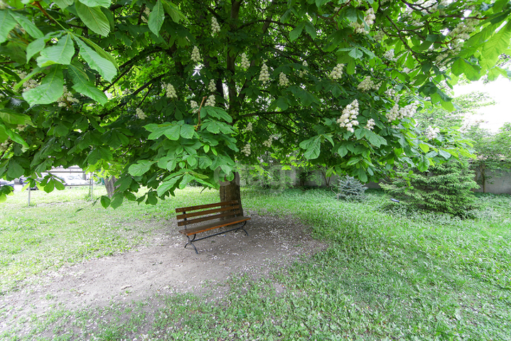 Окна смотрят на зеленую аллею, которая хорошо скрывает прямые солнечные лучи и не доставляет дискомфорта.