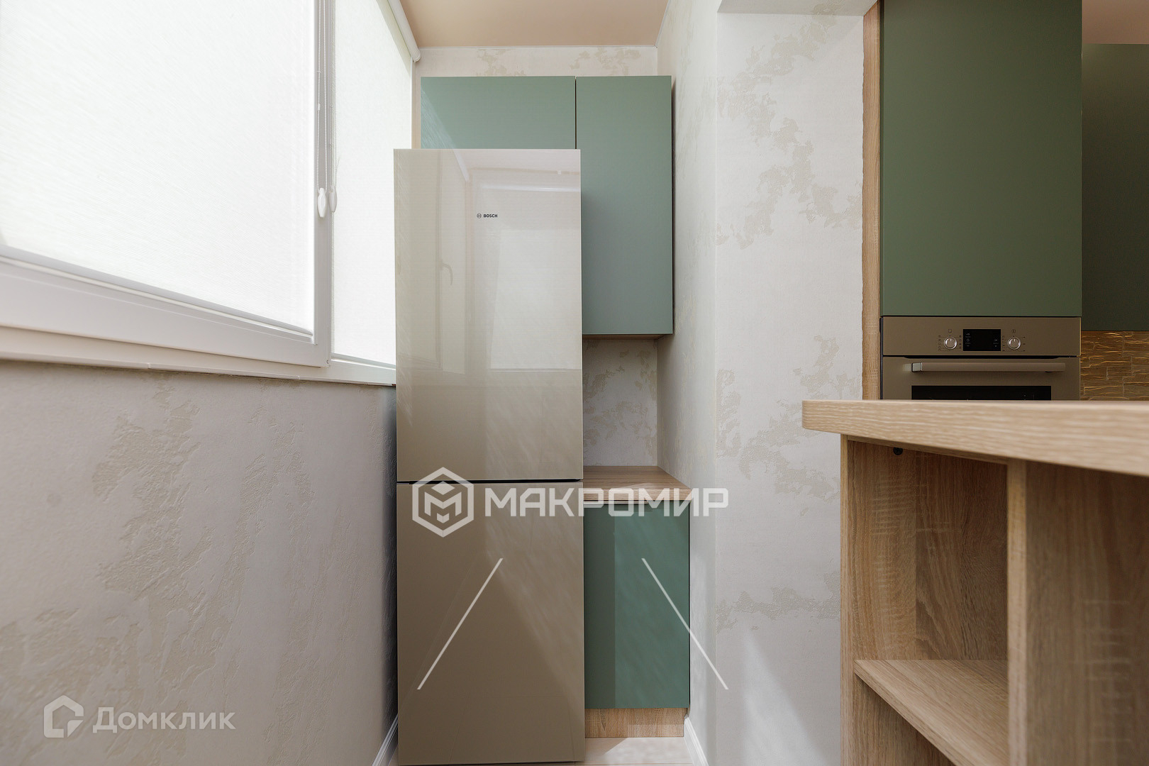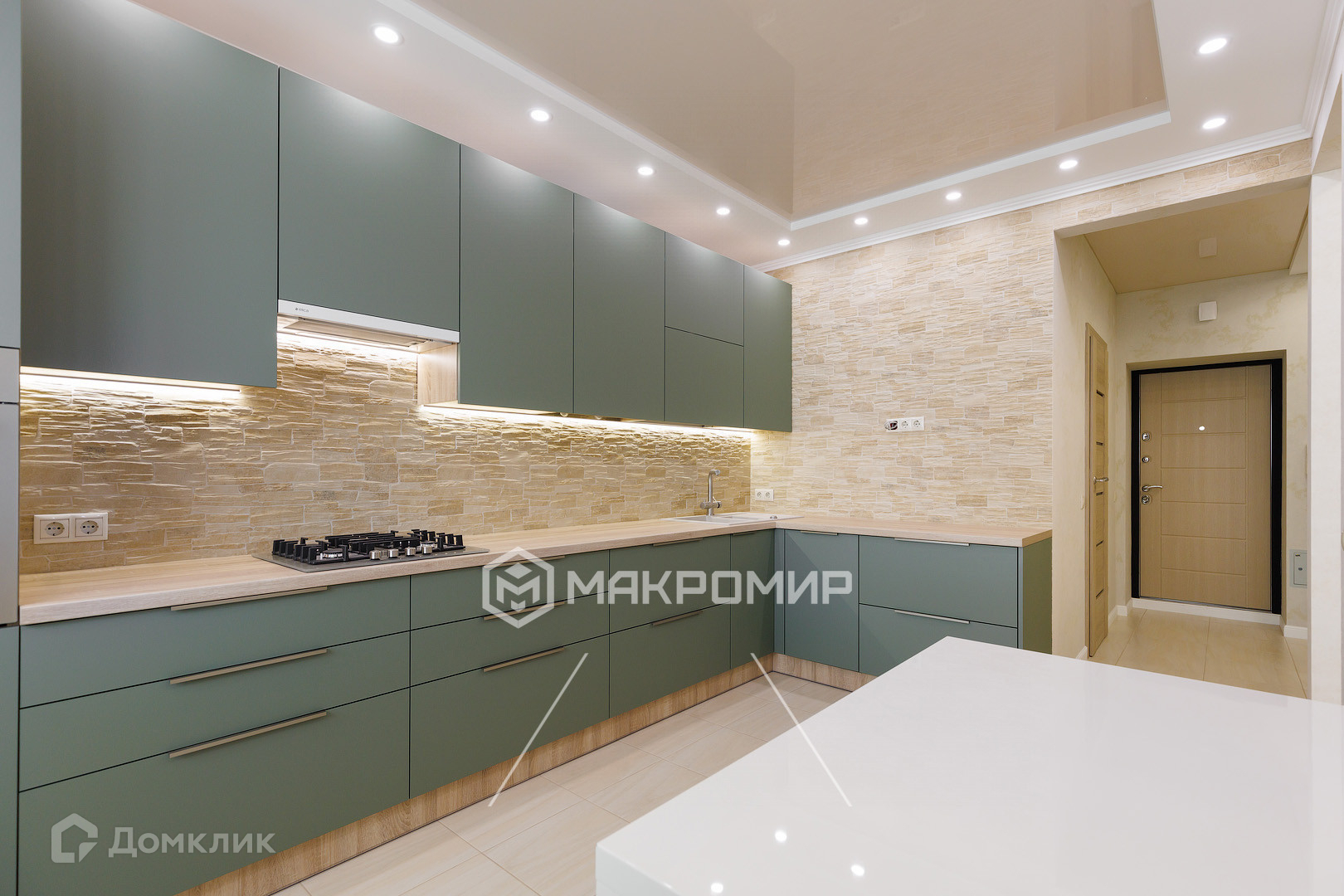 Кухня 12.1 м2, оборудованная новой современной встроенной мебелью и техникой: вытяжка, варочная поверхность, духовой шкаф, встроенная микроволновка, холодильник и морозильная камера.