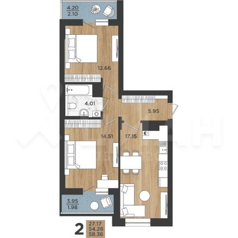 Общая площадь 58.4 м2