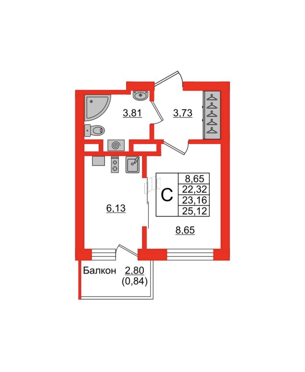 Общая площадь 25.32 м2