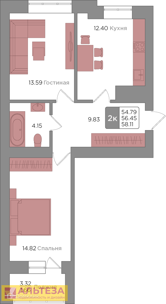 , Калининград г, Центральный, Новгородская улица 3Ак7, 2 комн., общ. пл. 56.45 кв.м., жил.пл. 30.81 кв.м., комнаты 14.82/15.99, кухня 10 кв.м., 2/9 этаж, окна двор, санузел совмещенный, балкон, без отделки, Номер лота: 4187129