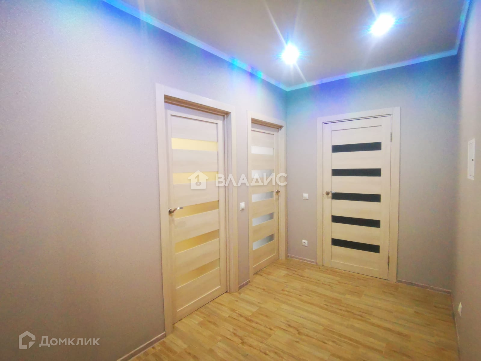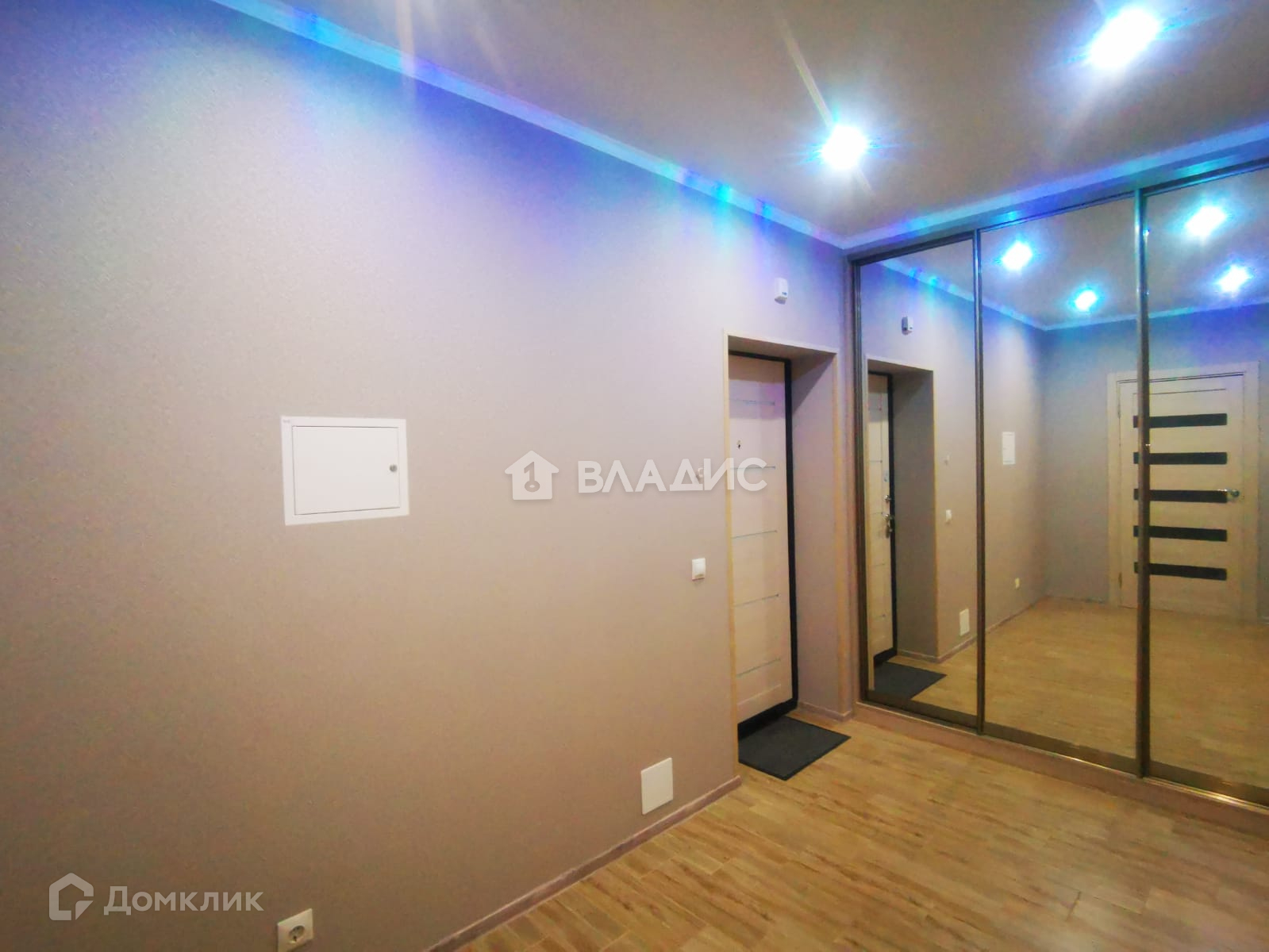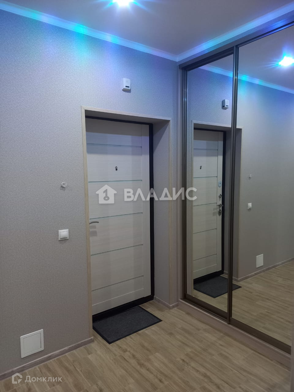 Коридор правильной формы. На полу уложена плитка. Стены - качественные обои, потолок натяжной с точечными светильниками. В коридоре вместительный большой шкаф-купе с зеркальными дверями.
