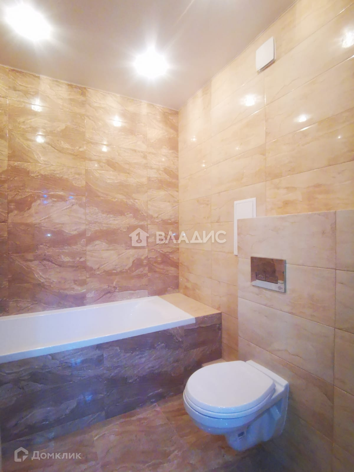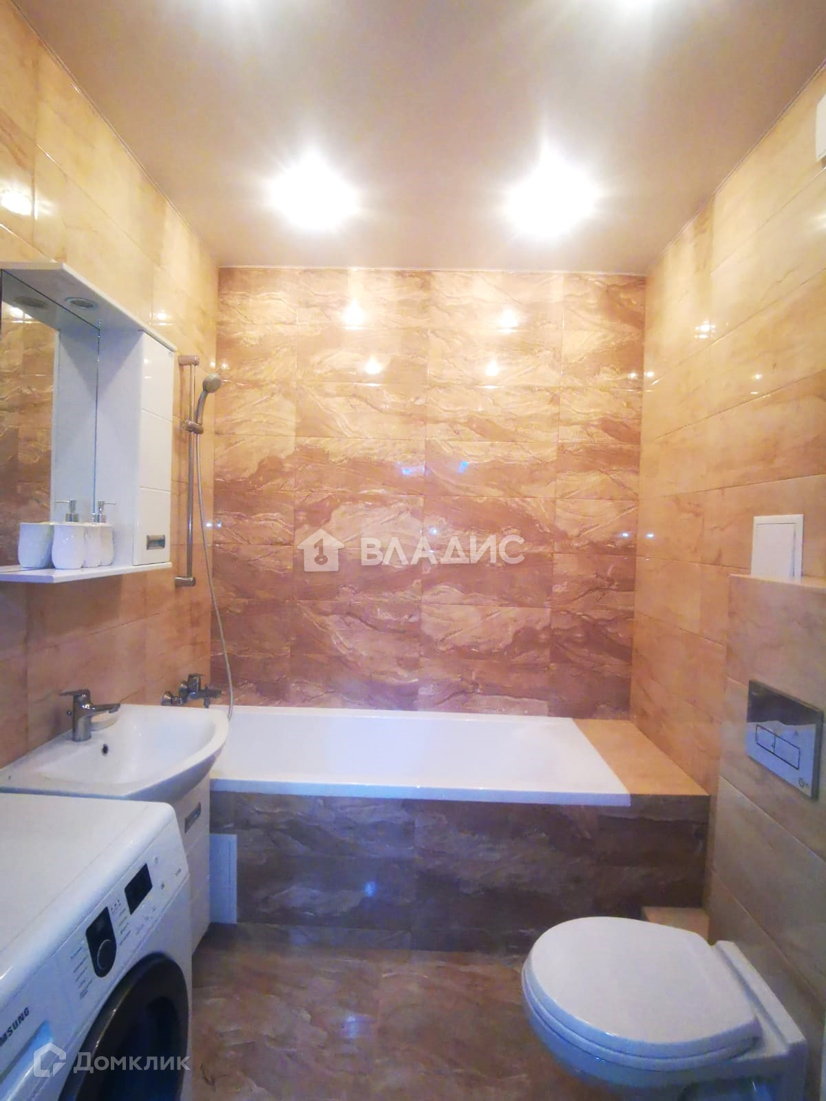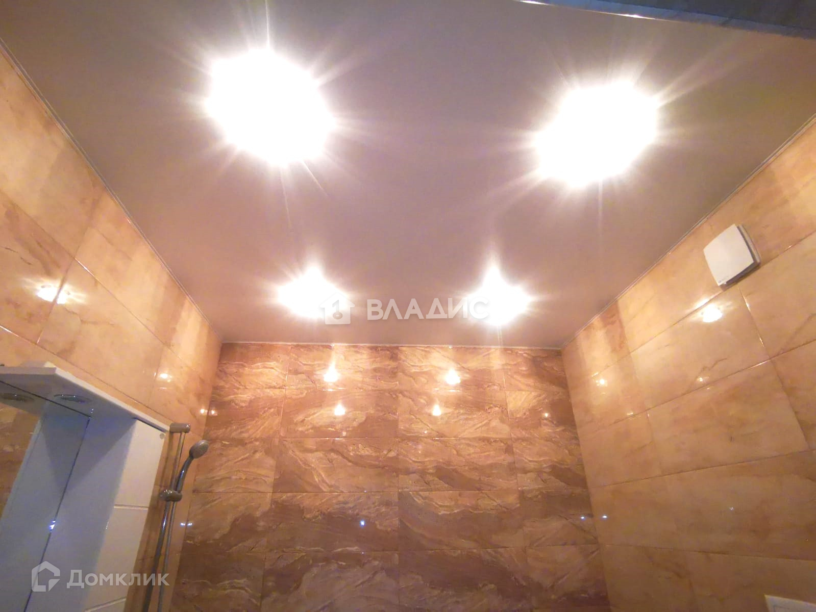 Санузел совмещенный, полностью в кафеле, натяжной потолок с точечными светильниками, установлена принудительная вентиляция при включении света.