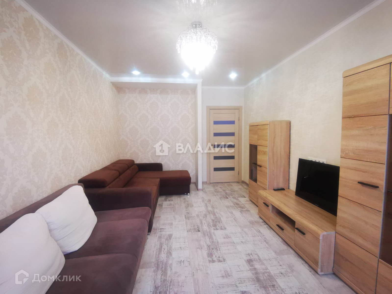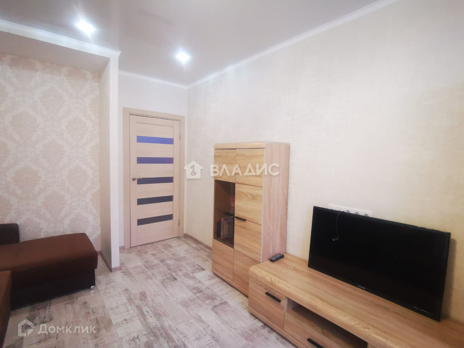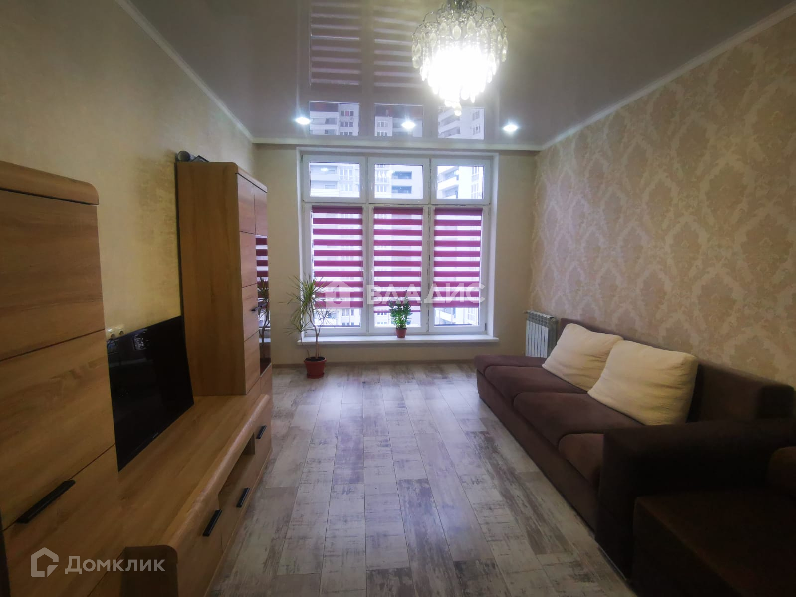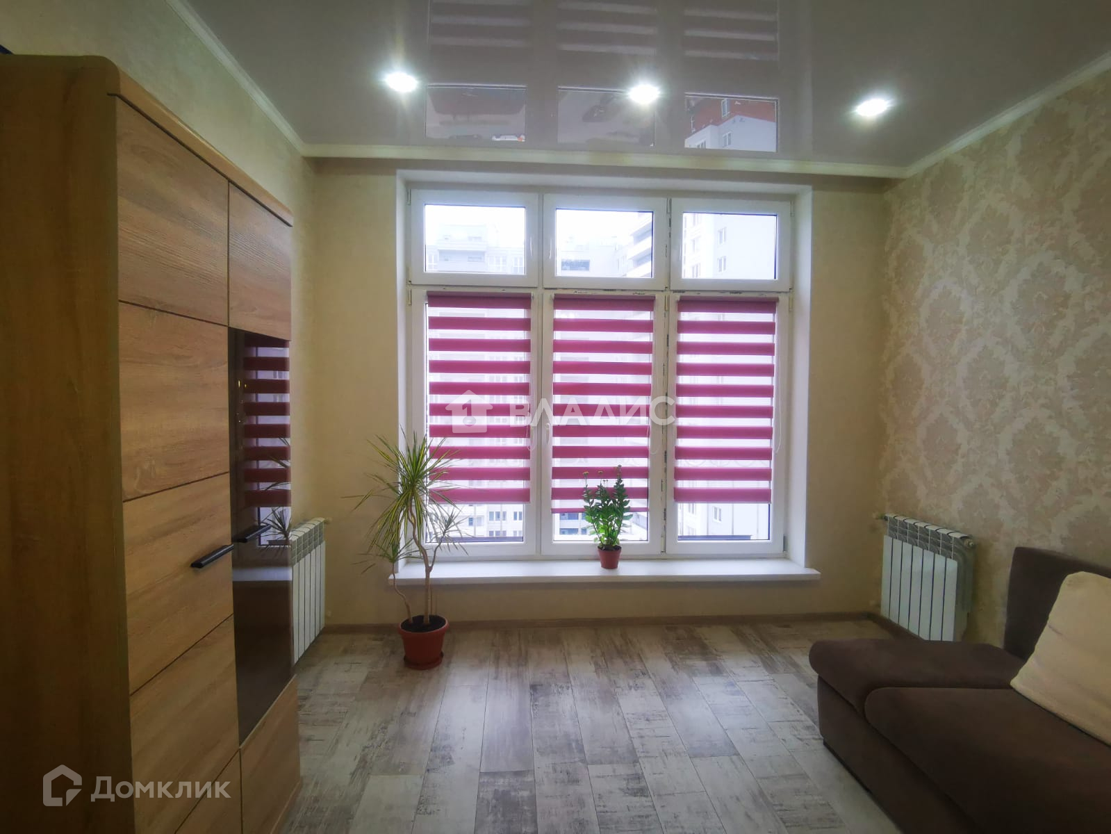 В комнате уложен ламинат, стены с обоями, потолок-глянцевый натяжной, смонтирована ниша для шкафа