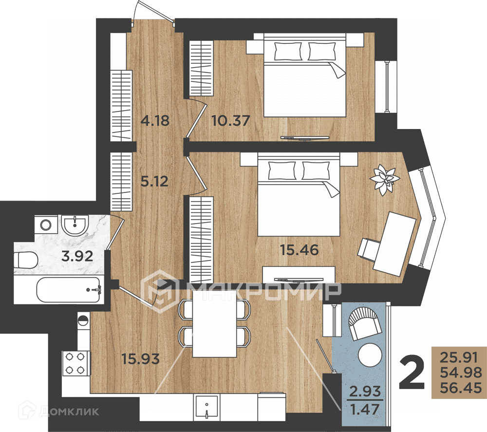 Общая площадь 56.5 м2