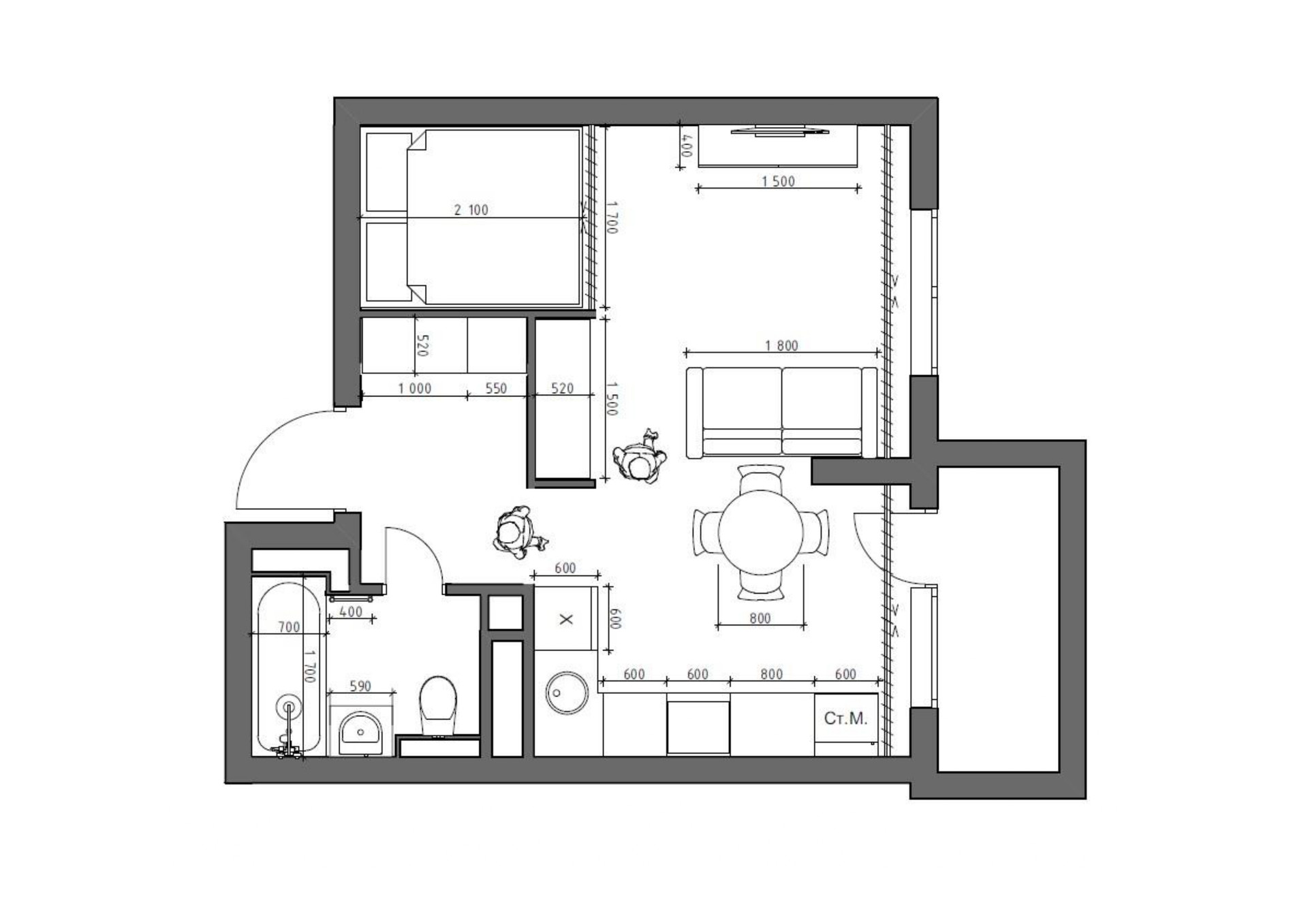 Общая площадь 34 м2