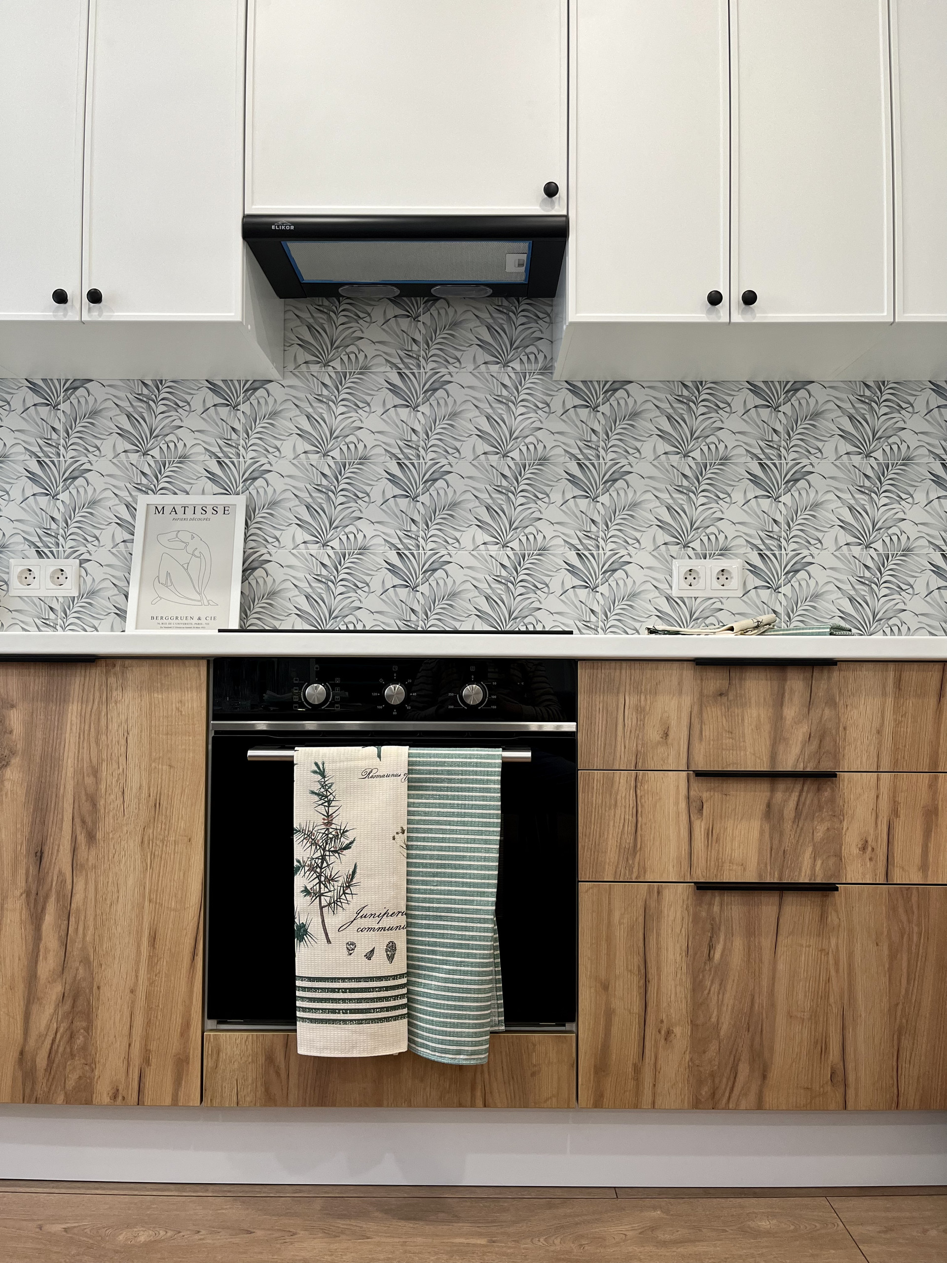 Большая и эргономичная зона для готовки, фартук из кафеля с принтом растений;