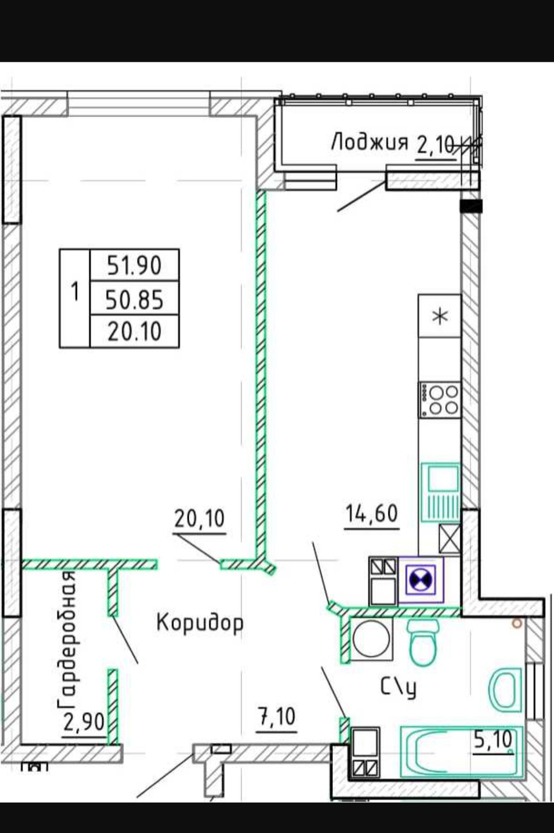 Общая площадь квартиры- 51,9 м2.