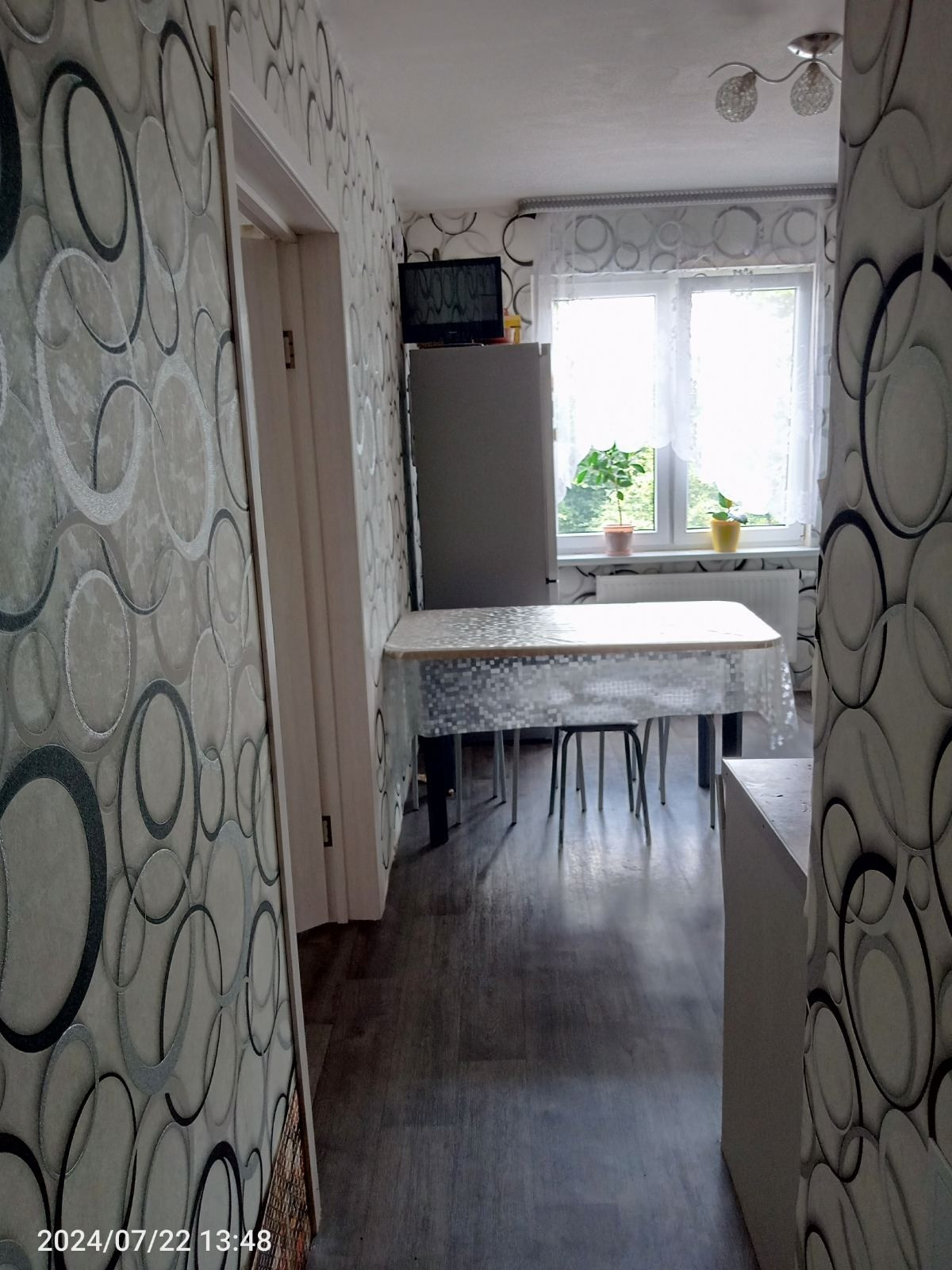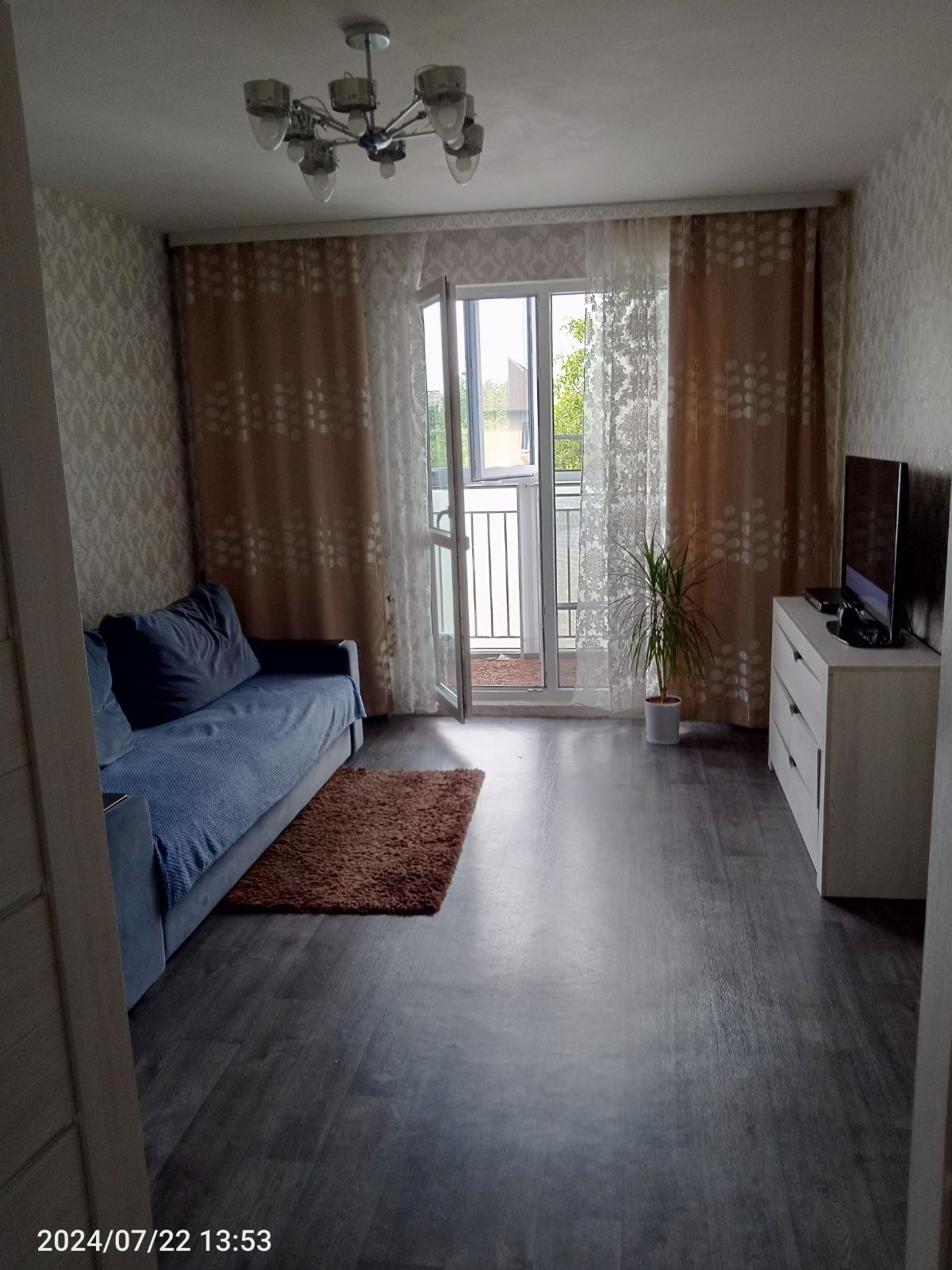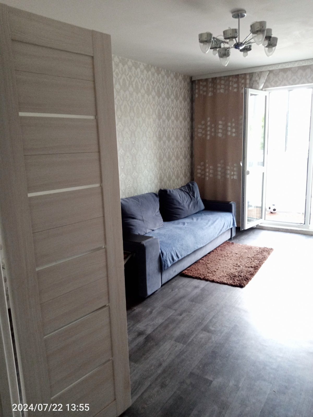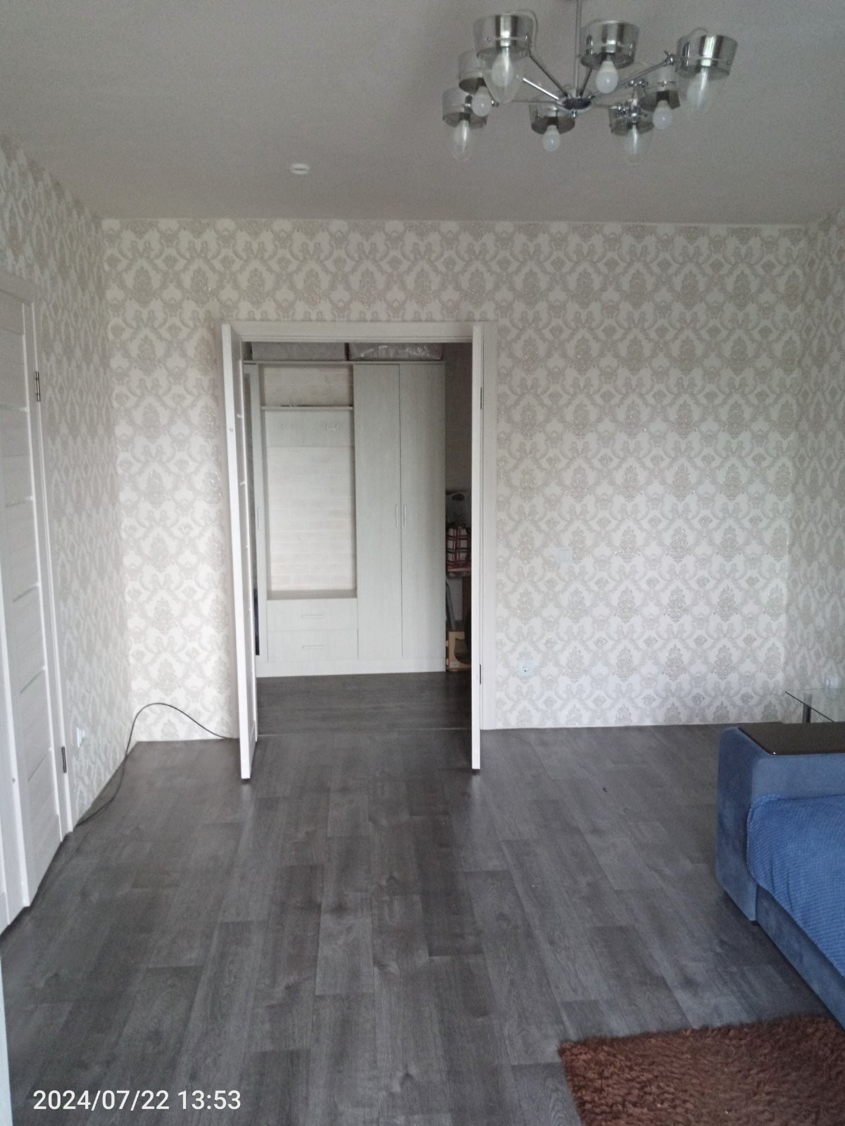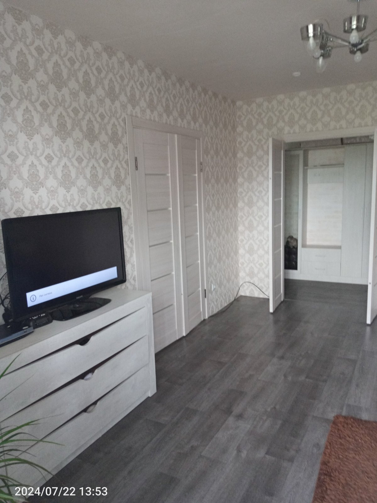 Хороший косметический ремонт. Стены обои, потолок отштукатурен, на полу плитка/ламинат.