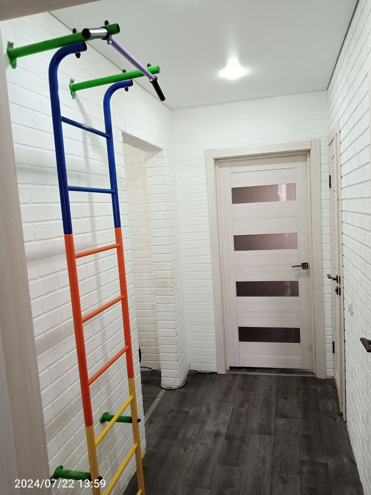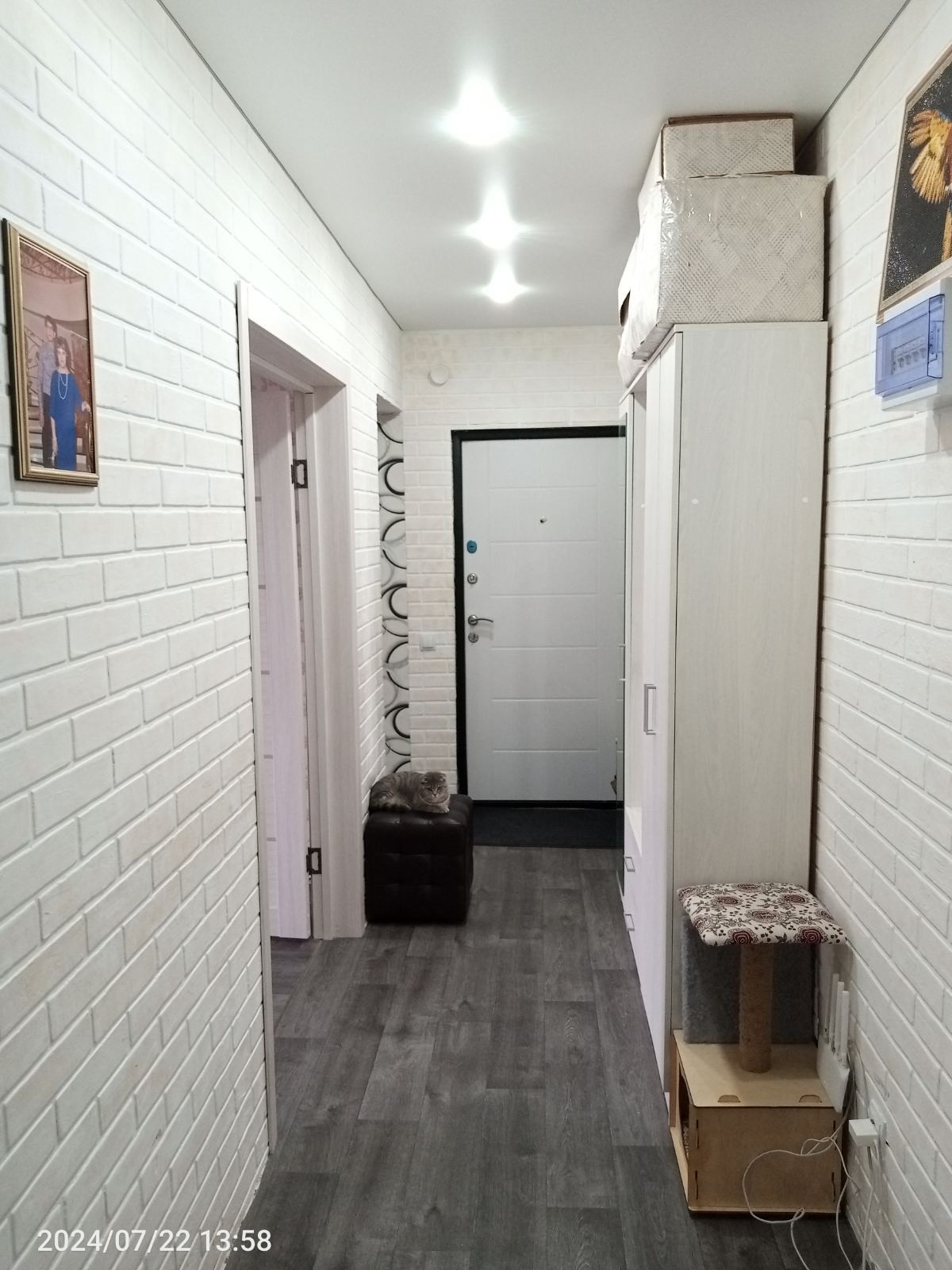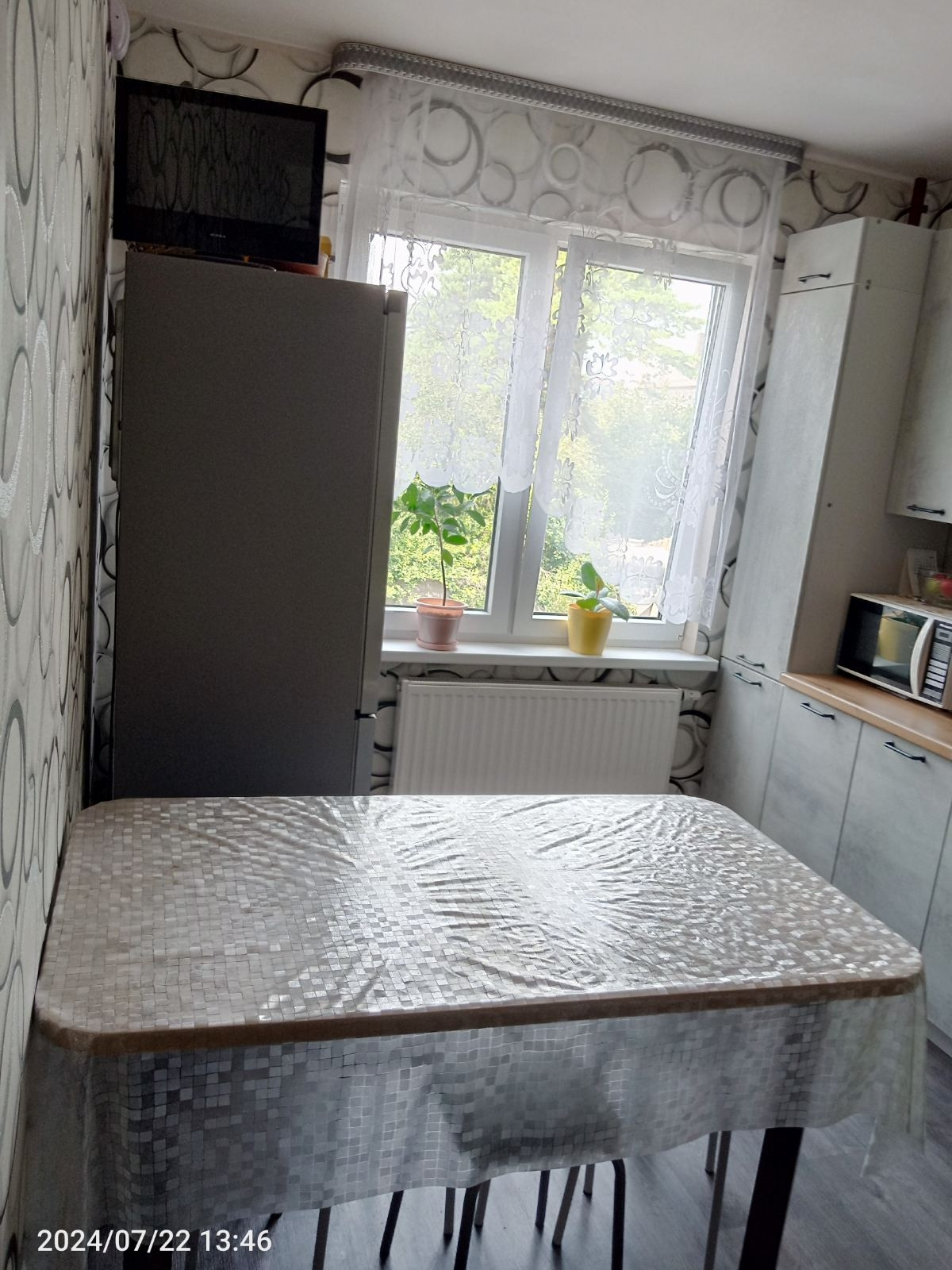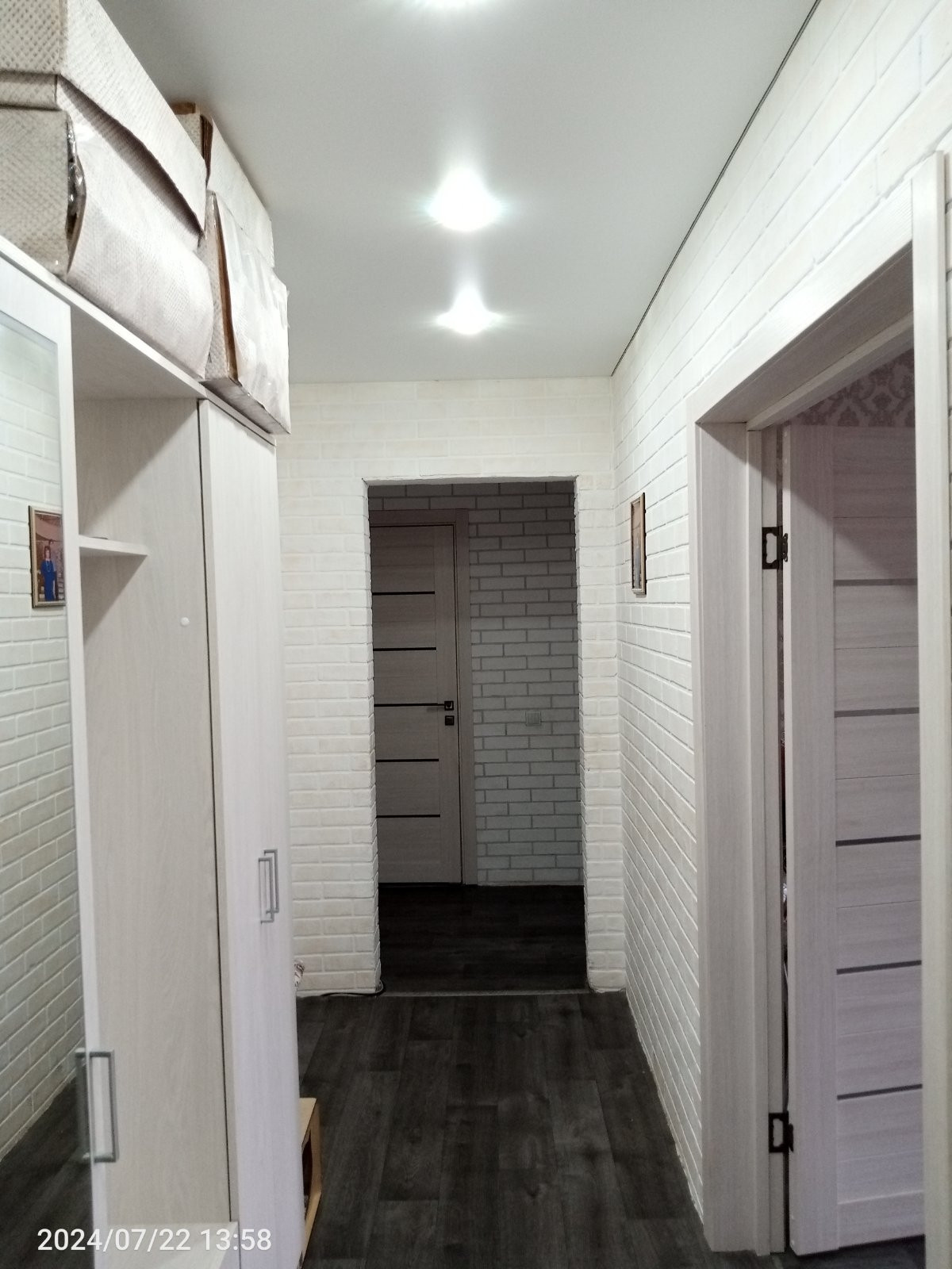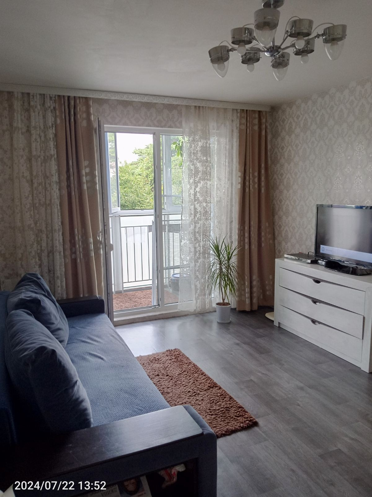 Хороший косметический ремонт. Стены обои, потолок отштукатурен, на полу плитка/ламинат.