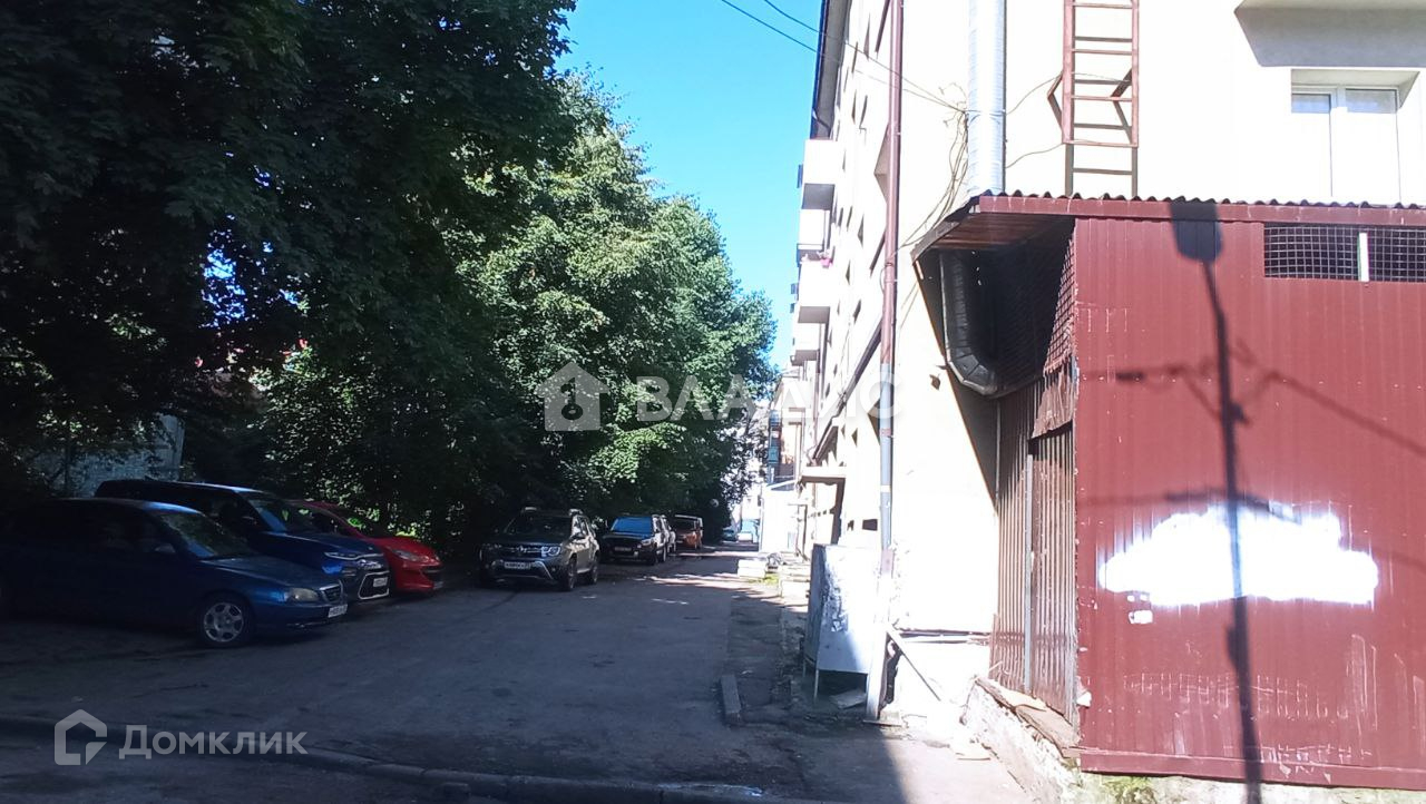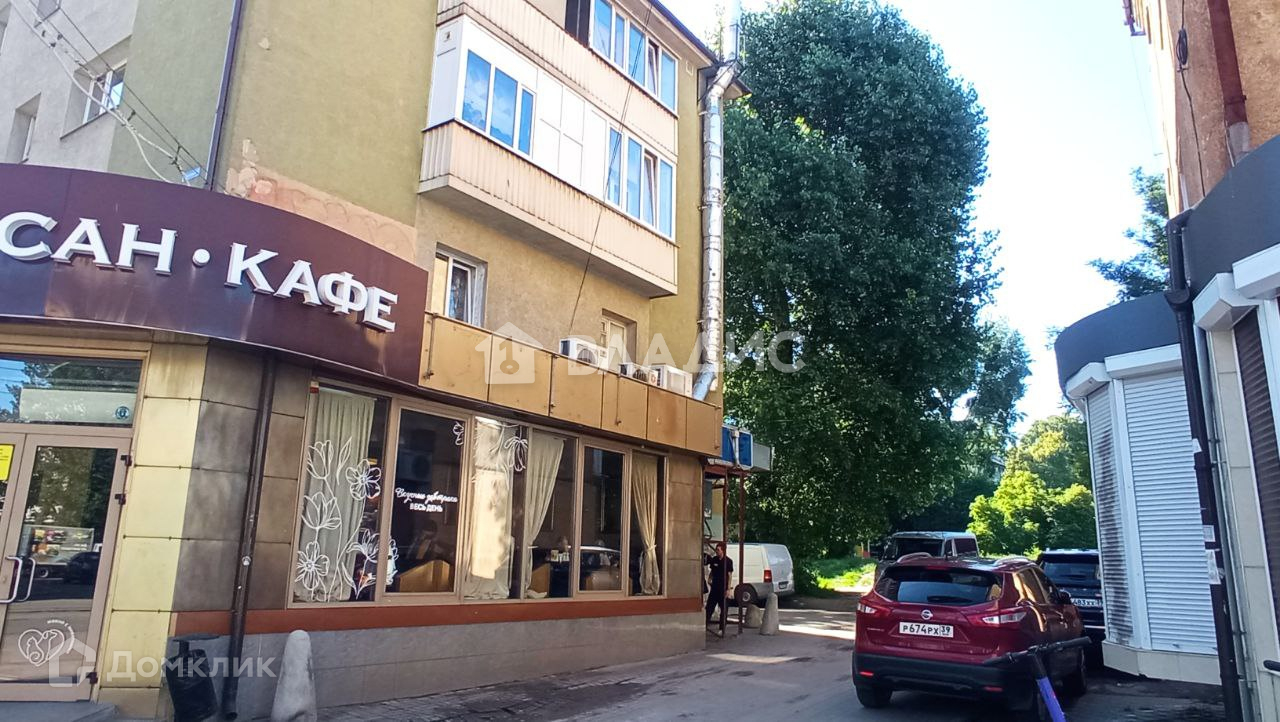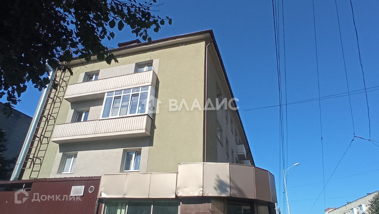 На доме свежий фасад после ремонта. На нижнем этаже здания расположен супермаркет "Семья" и "Круассан кафе".