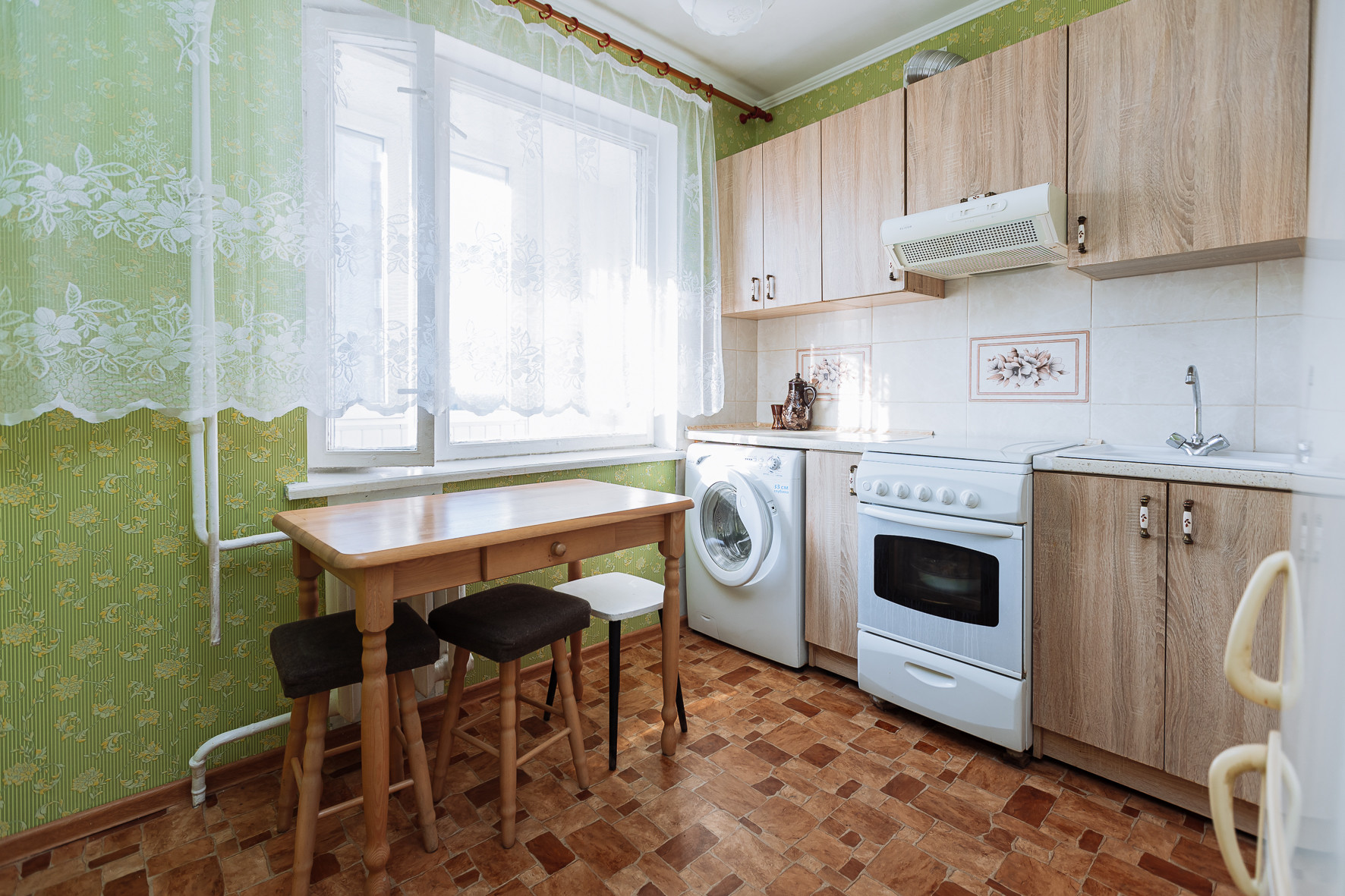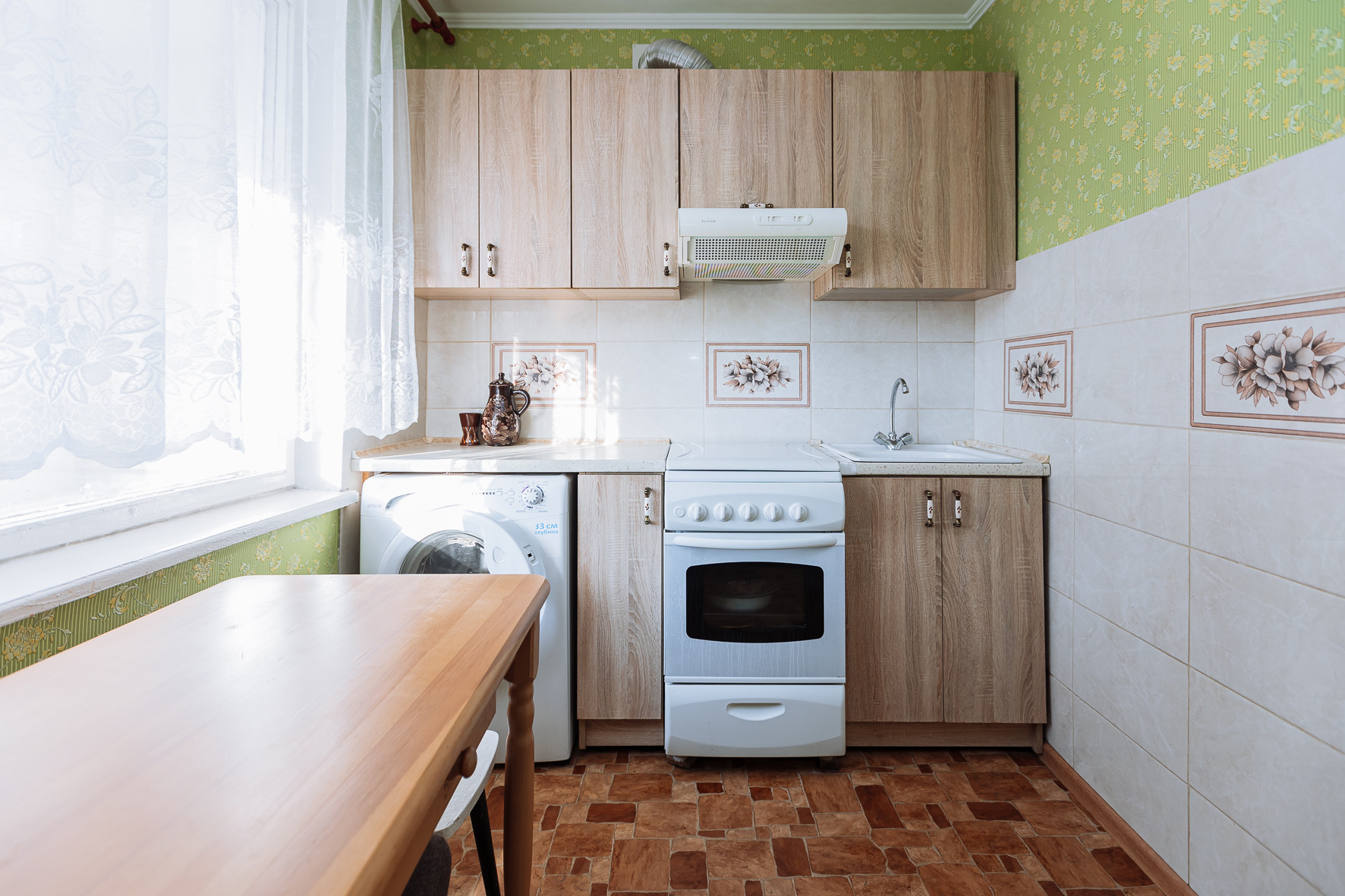Кухня достаточно просторная, что бы использовать ее и как столовую. Выделена обеденная зона .