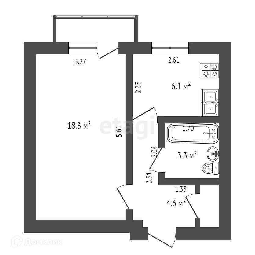 Общая площадь 33.4 м2