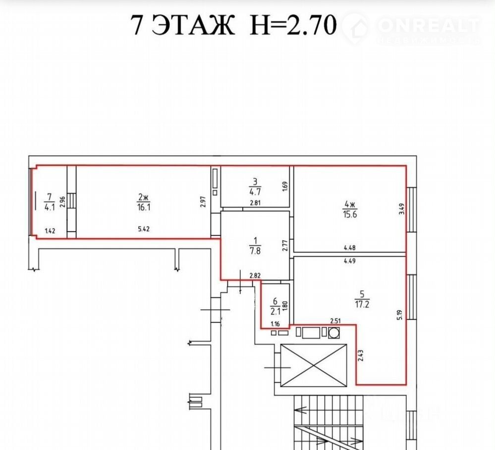 Общая площадь  67.6 кв.м, жилая площадь  31.7 кв.м (комнаты по 16 метров), просторная кухня   17.2 кв.м. Высота потолков - 2.7 метра.