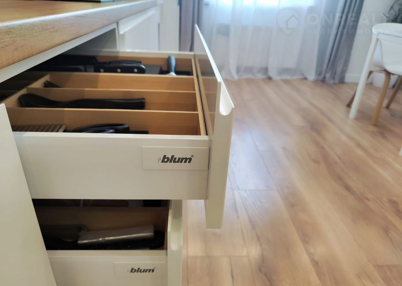 Мебель выполнена под заказ,кухня с крашеными МДФ фасадами, фурнитура Вlum.