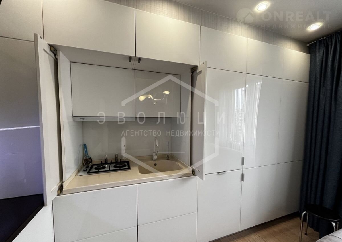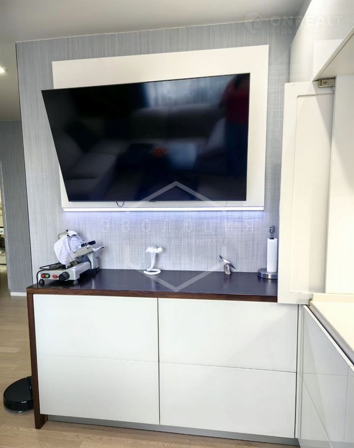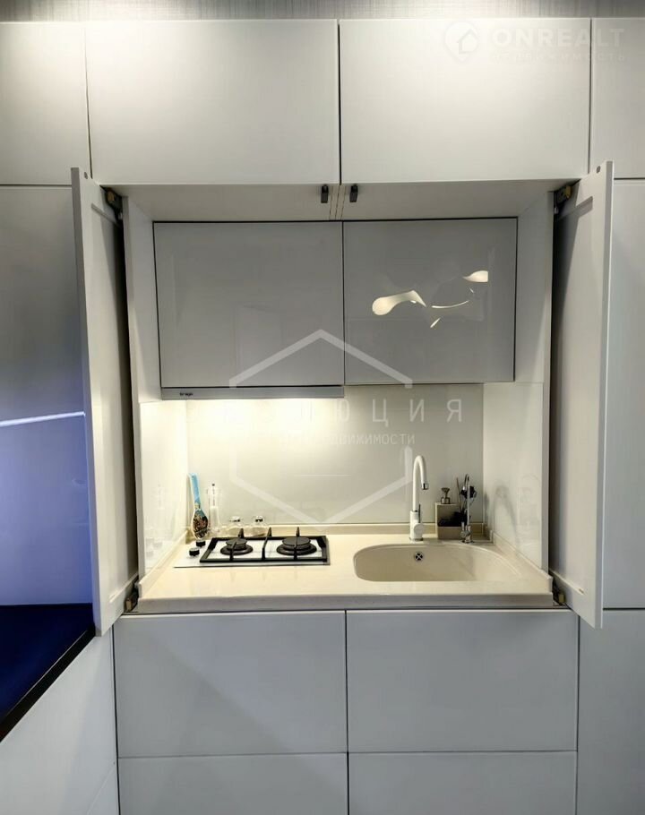Установлена скрытая кухня с фасадами из белого стекла, что создает ощущение единого пространства с гостиной!