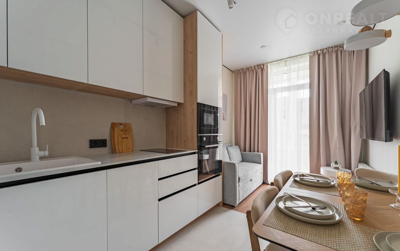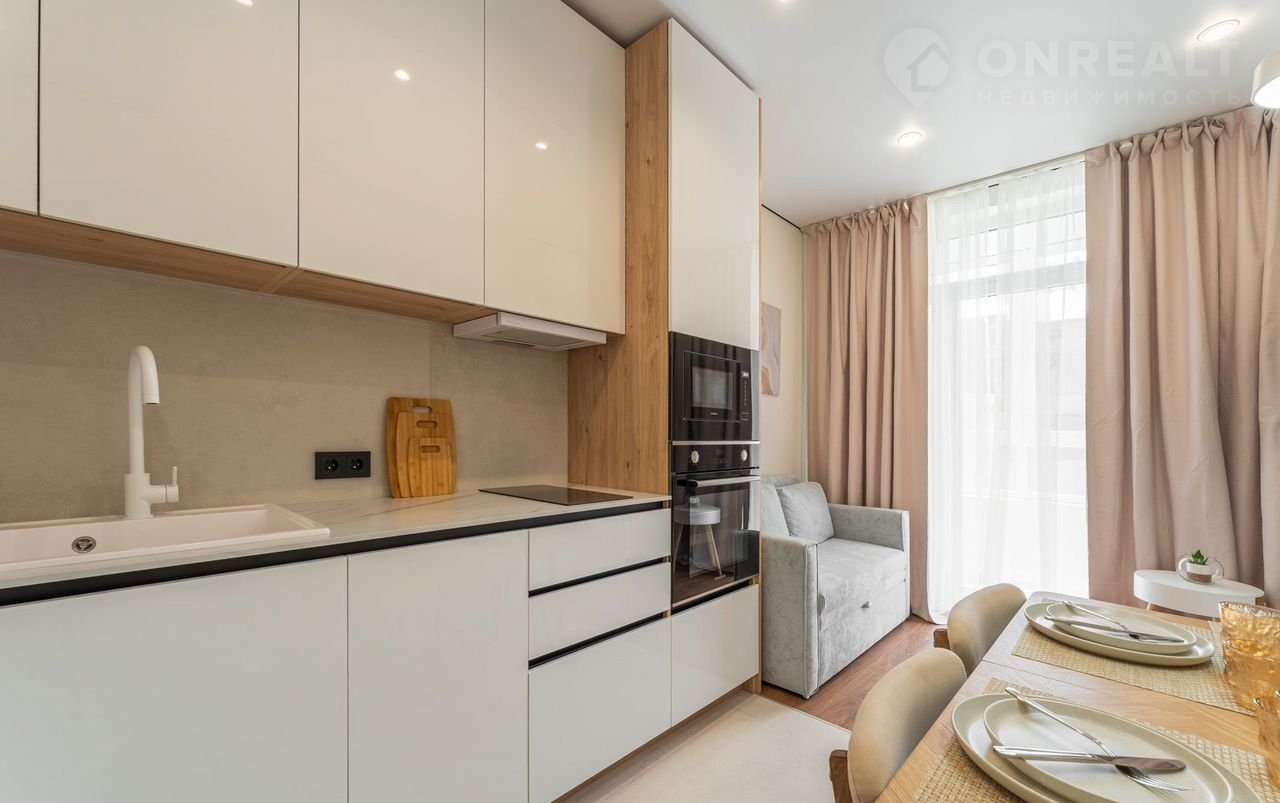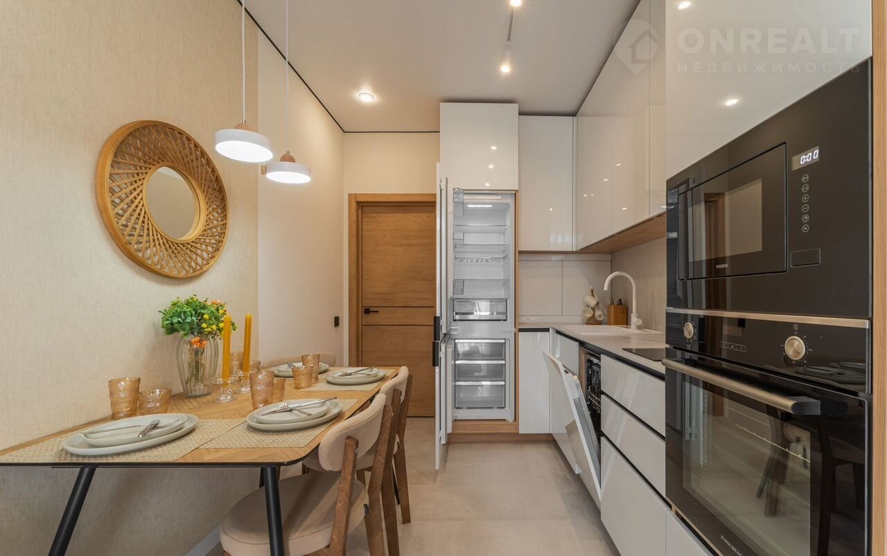 — укoмплектована встраиваемой бытовой техникой (духовой шкаф, варочная панель, посудомойка, холодильник, вытяжка, чайник, свч, стиральная машинка)