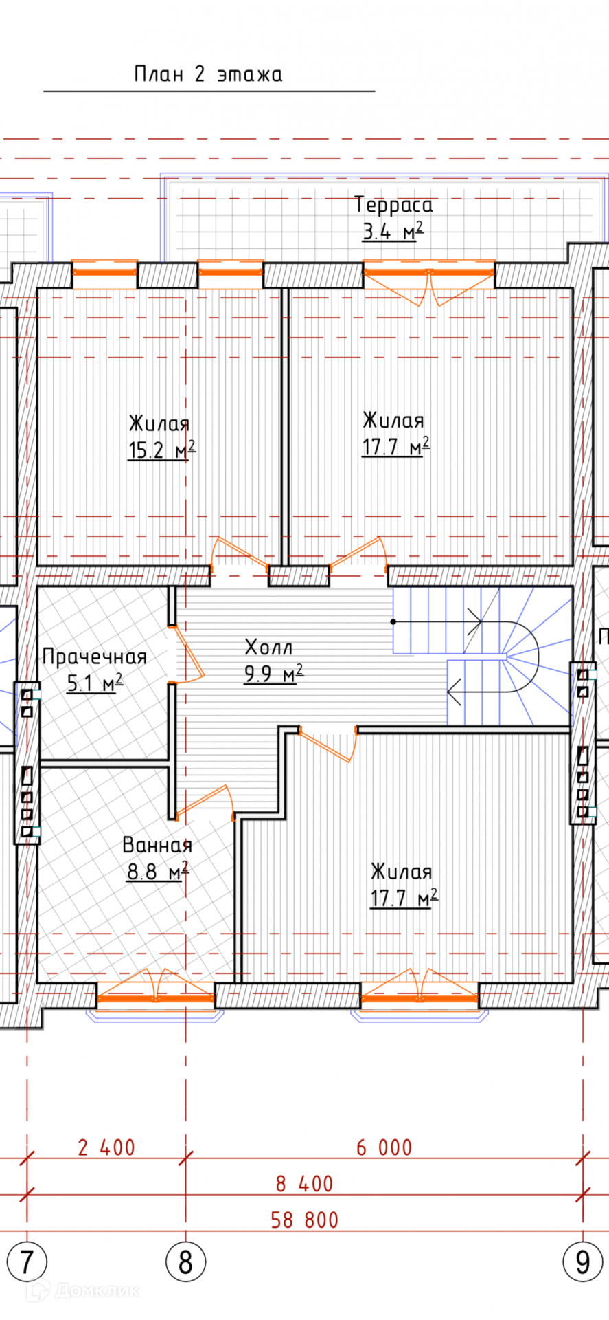 -Второй этаж: три жилых комнаты, гардеробная комната, большой санузел с окном.