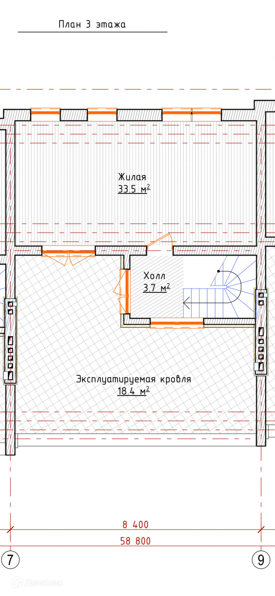 -Третий этаж : большая жилая комната 34 м2 и эксплуатируемая терраса (40 м2).