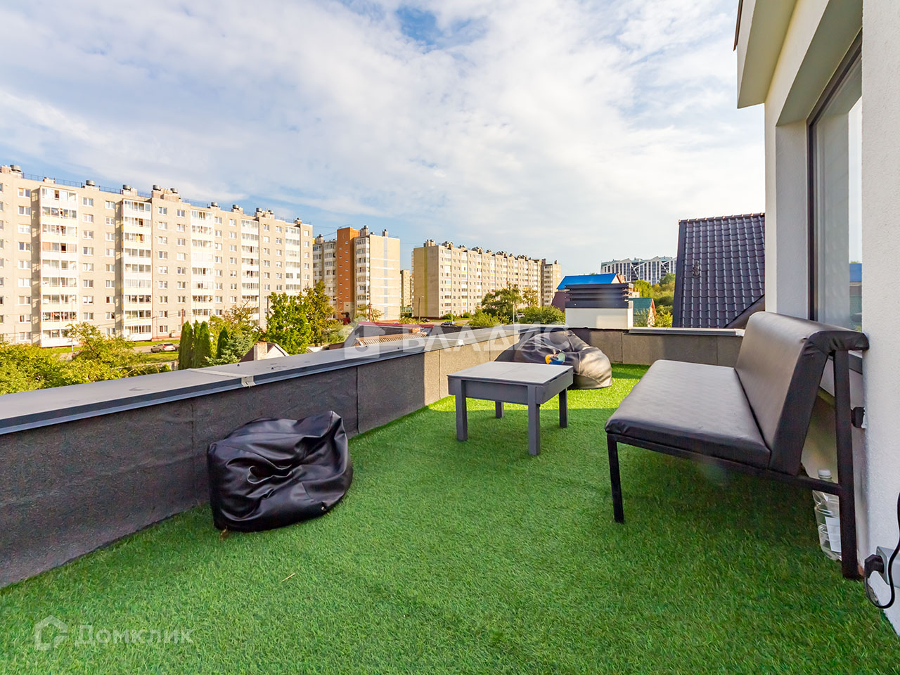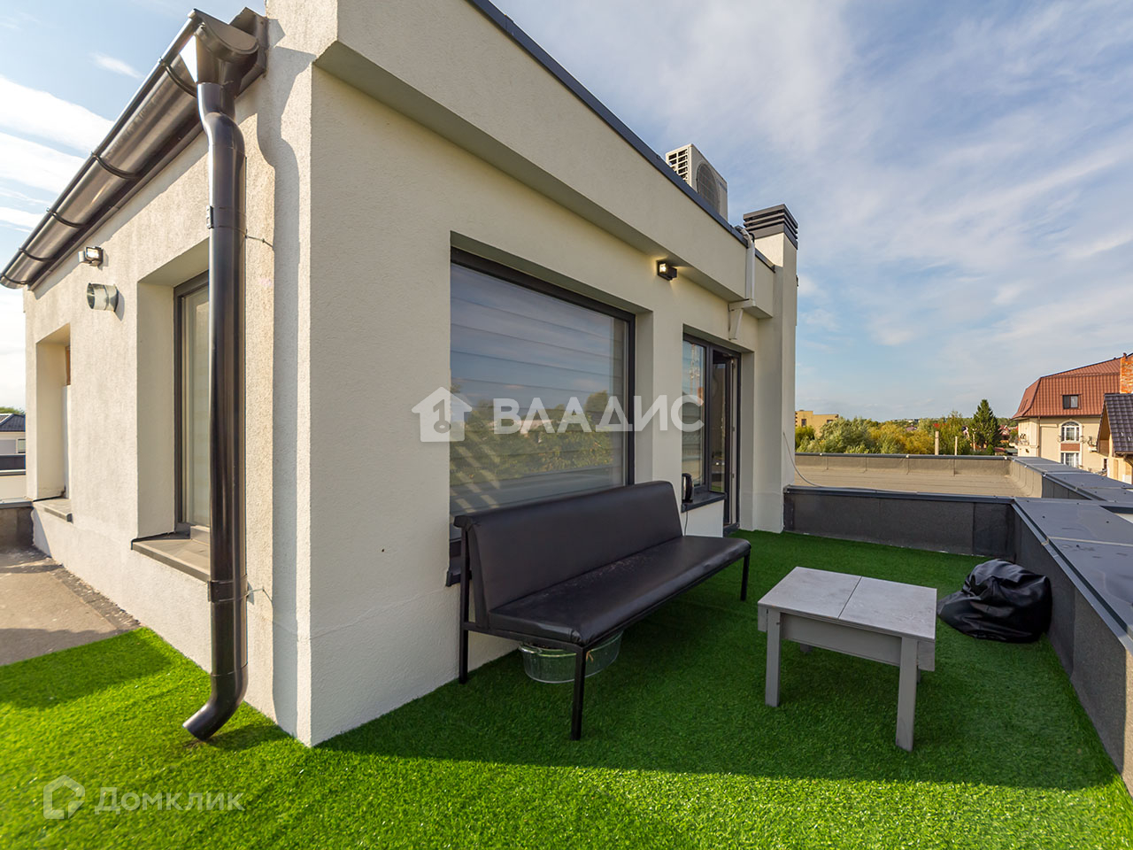 Кровля эксплуатируемая, на ней оборудована зона отдыха с диваном, креслами и небольшим столиком.