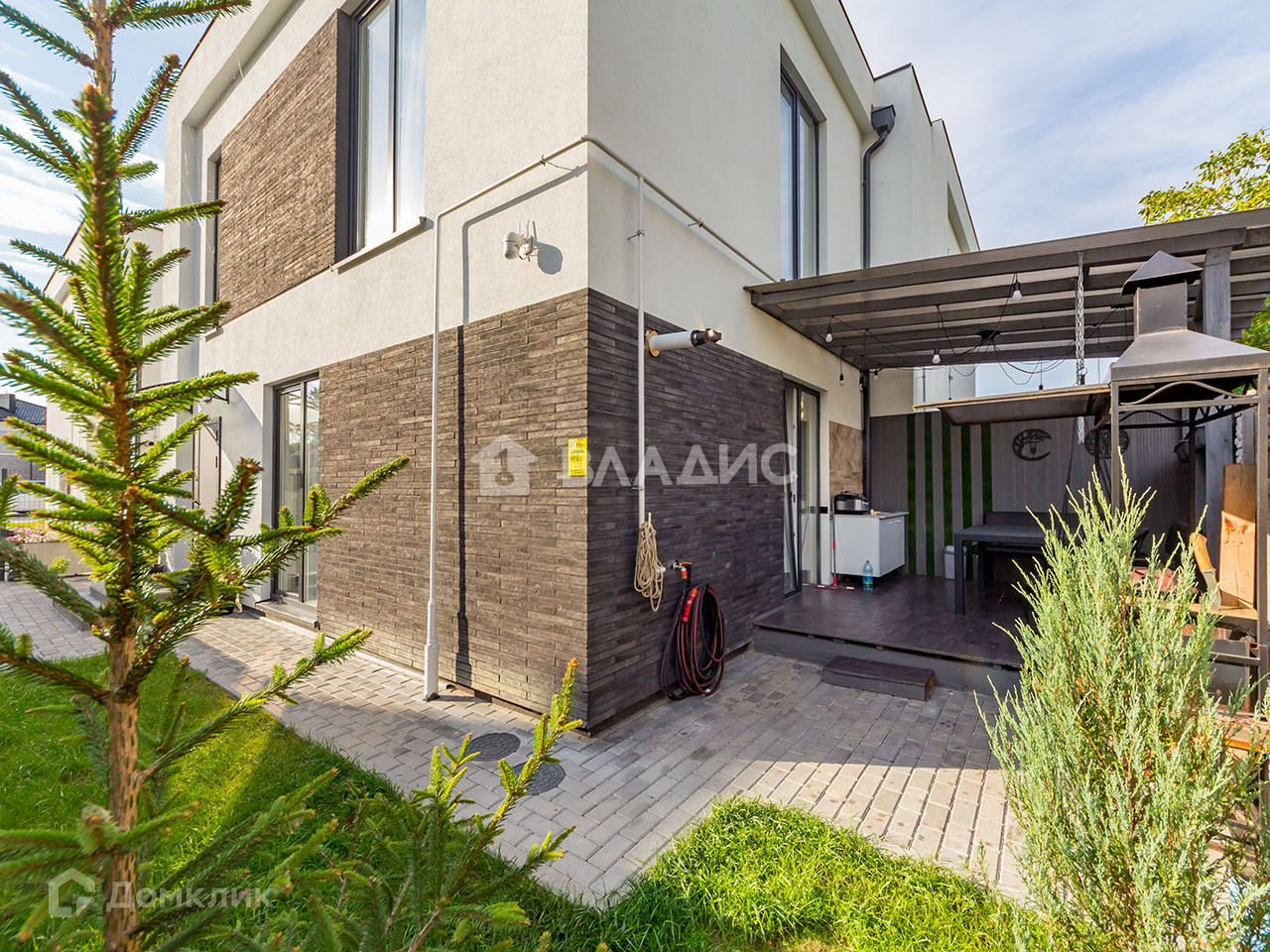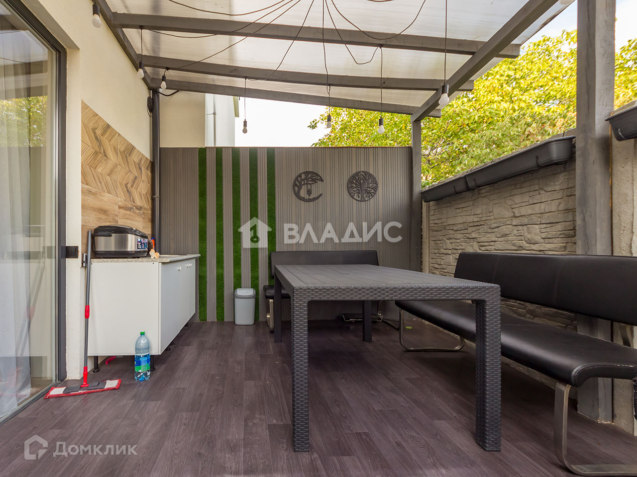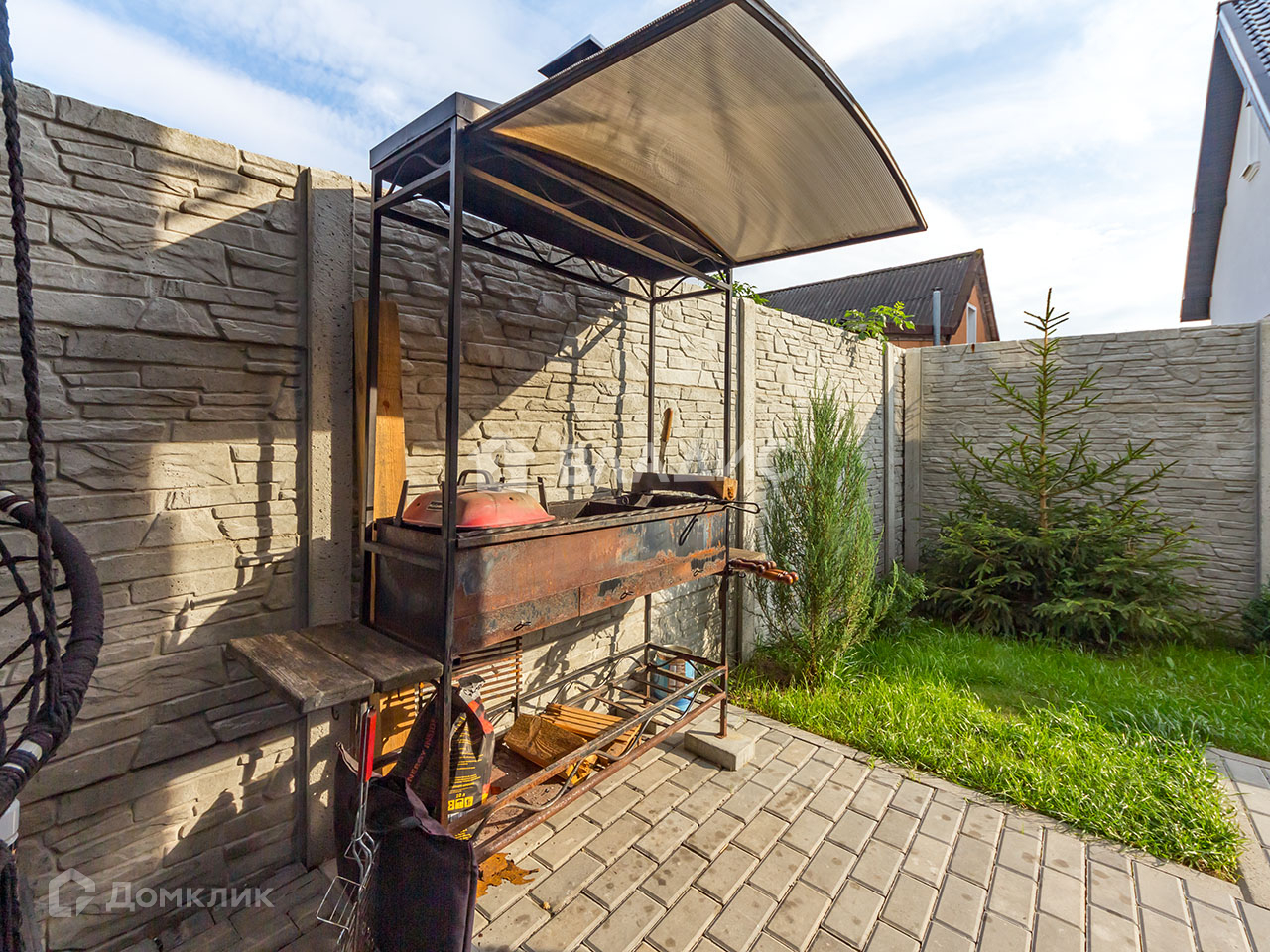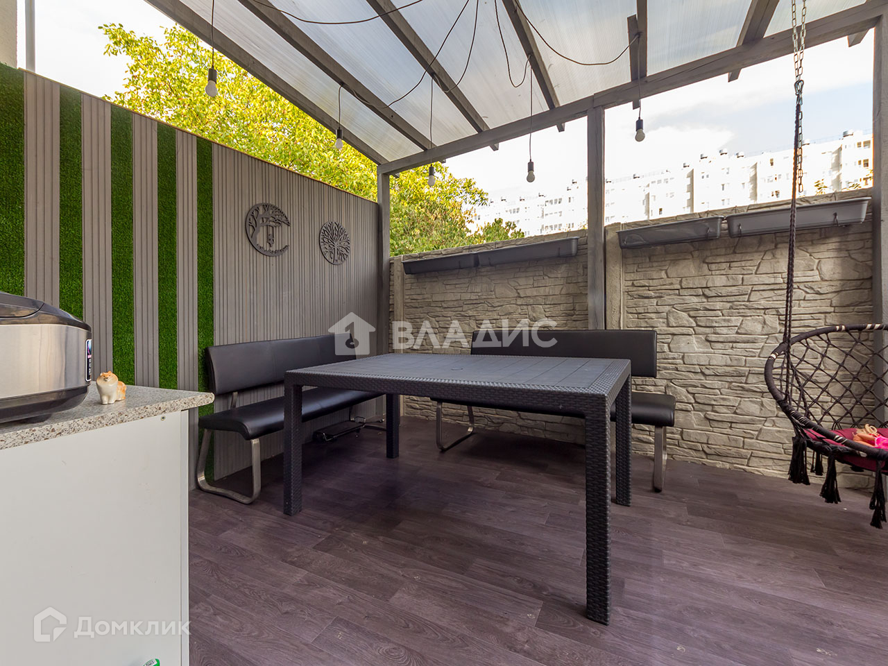 Есть выход на благоустроенную террасу с диванной зоной и мангалом. Продумано всё до мелочей, даже освещение