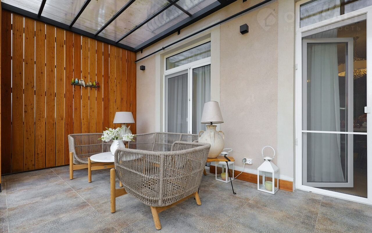 - Просторная крытая веранда с раздвижными дверьми и видом на благоустроенный участок